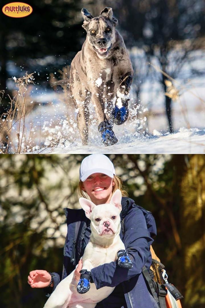 靴を履かせることで、雪や氷、凍結防止剤の塩分から足を保護することができます。