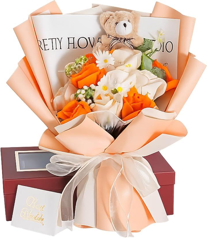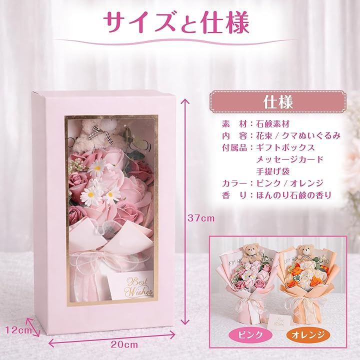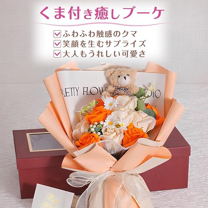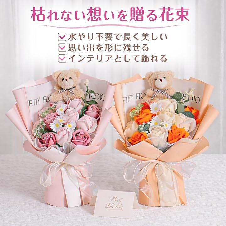 枯れないソープフラワー花束」 石鹸素材から一枚ずつ丁寧に作られたソープフラワーの花束は、生花のような美しさを長く保つ造花です 。