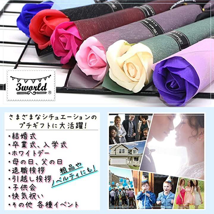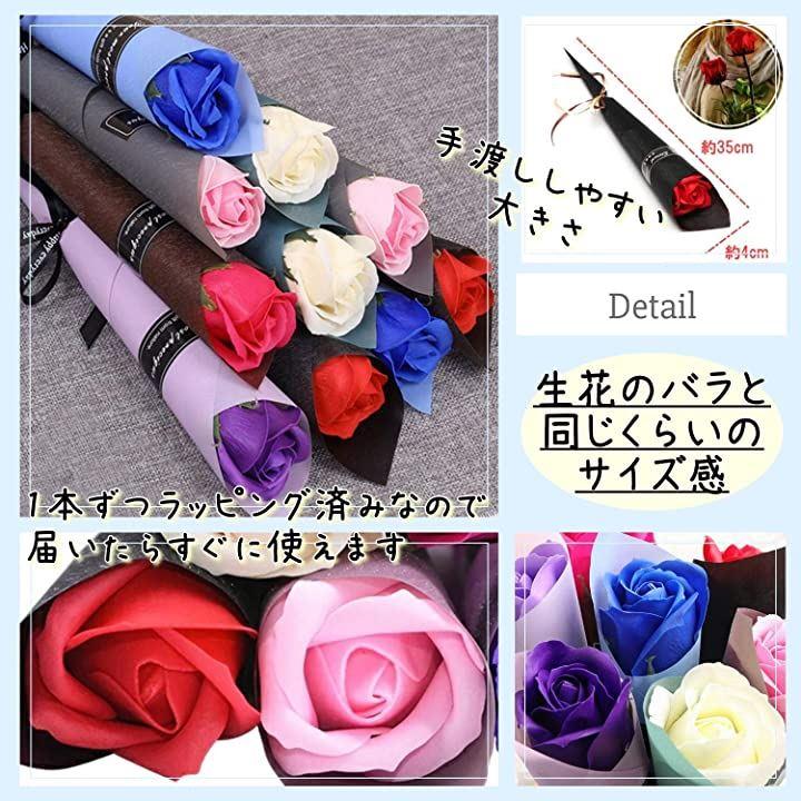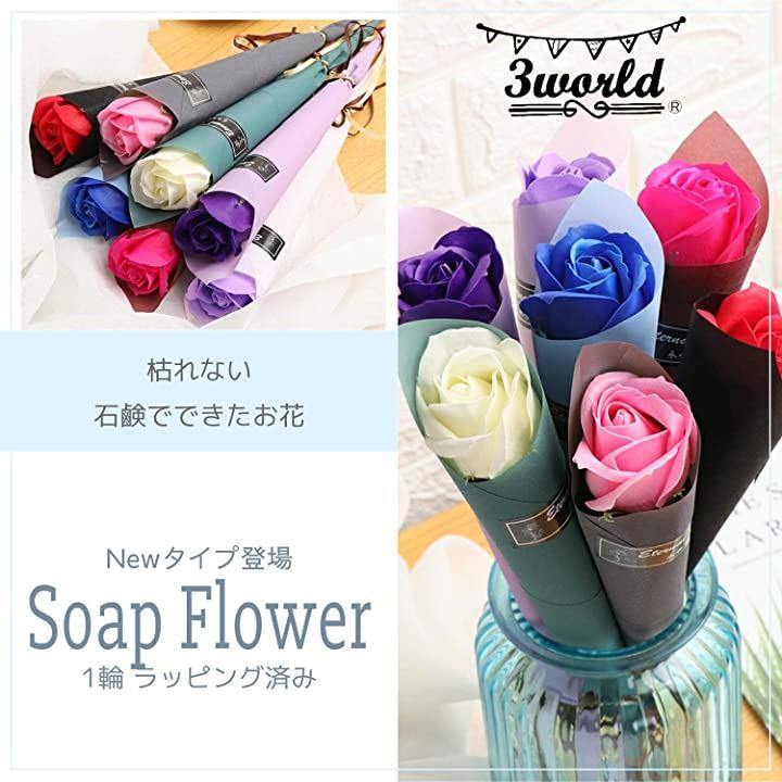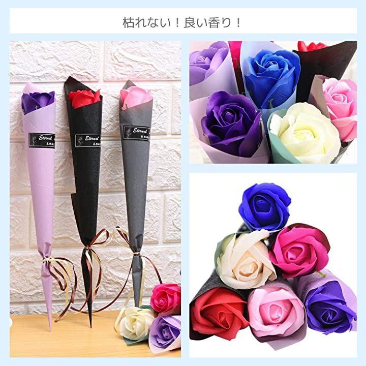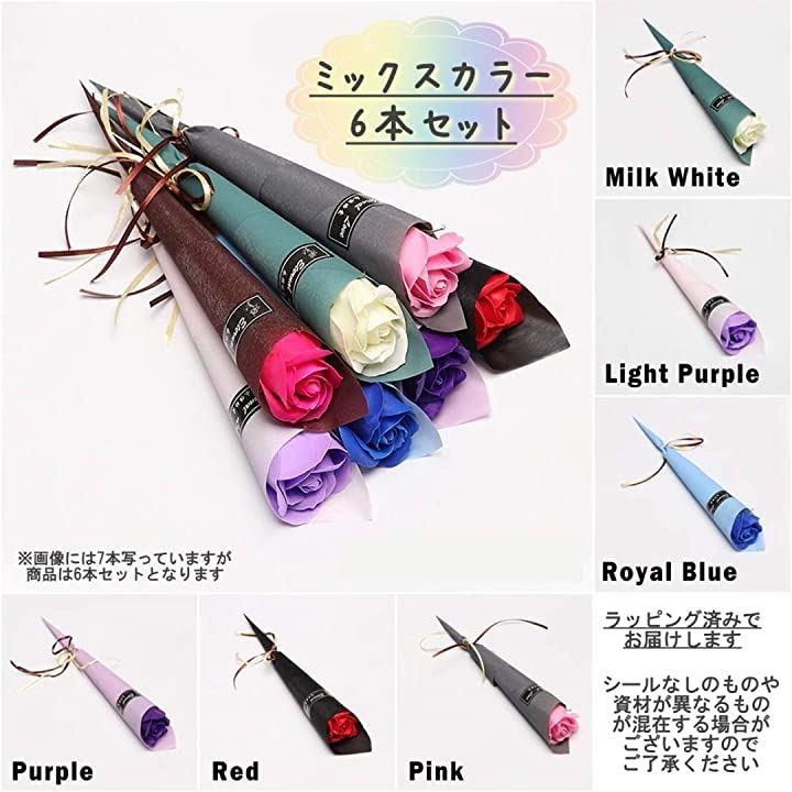 ・「セット内容」ラッピング済み ソープフラワー 6本 「カラー」6色(レッド、ホワイト、ピンク、ブルー、パープルなど) ご注意:カラーやラッピング資材、シール、リボンなどは製造ロットにより仕様が変更になる場合がございます。