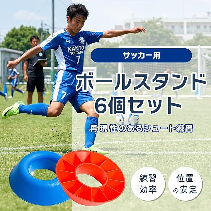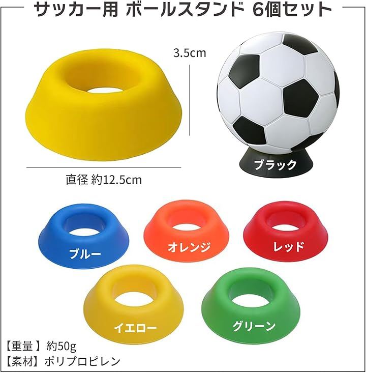 「商品内容」サッカー用 ボールスタンド 6個セット 「カラー」レッド/オレンジ/イエロー/ブルー/グリーン/ブラック 「サイズ」直径 約12.5cm/高さ 約3.5cm/重量 約50g 「素材」PP(ポリプロピレン)