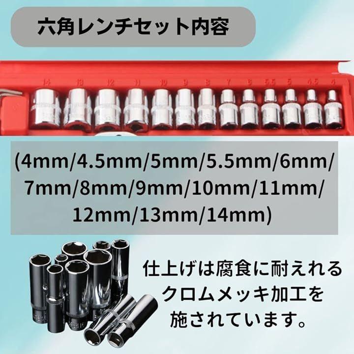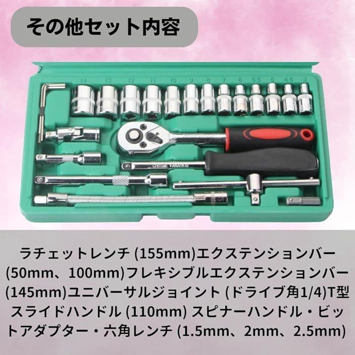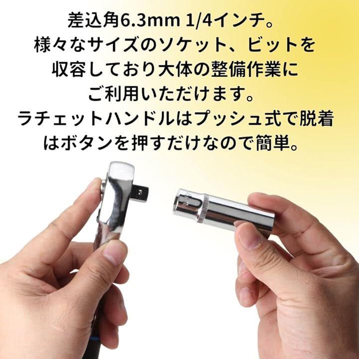 「他セット内容」ラチェットレンチ (155mm)エクステンションバー (50mm、100mm)フレキシブルエクステンションバー (145mm)ユニバーサルジョイント (ドライブ角1/4)T型スライドハンドル (110mm) スピナーハンドル・ビットアダプター・六角レンチ (1.5mm、2mm、2.5mm)