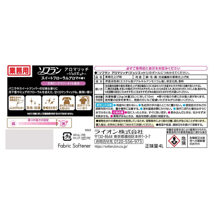 商品紹介 【あなたが選んだときの香り、変わらず続くのはただひとつ。唯一(※1)、裏切らない香り】 ・“天然スイートオレンジオイル"配合。 ・植物生まれの柔軟成分がセンイの1本1本まで柔らかく仕上げ、静電気も防ぎます。 ・防臭・抗菌(※2)効果で、衣類につく汗やタバコなどのイヤなニオイを抑えます。 ・赤ちゃんの衣類もやわらかに仕上げます。 ・部屋干し中もいい香り。 ・月夜に恋人を待つロマンティックな女性をイメージした、スイートフローラルアロマの香り「Juliette(ジュリエット)」 バニラやスイートアンバーの甘美な香りに月下香やミュゲのフローラルを加えた、ロマンティックな奥深い香り。 (※1)ソフランアロマリッチ内(従来品含む)・選んだときの香りの特徴が、注ぐときから脱ぐときまで、ずっと変わらずに続く“咲きたてアロマ製法"。 (※2)全ての菌に対して抗菌効果を有するわけではありません。 原材料・成分 界面活性剤 (エステル型ジアルキルアンモニウム塩)、安定化剤、香料 使用方法 【全自動洗濯機の場合】柔軟(仕上げ)剤自動投入口に本品を入れて洗濯する(すすぎ時に自動で投入される)。 【二槽式洗濯機、手洗いの場合】すすぎの水がきれいになったら本品を入れ、約3分まわすか、ひたした後、脱水する。 *洗濯機の設定に「ためすすぎ」と「注水すすぎ」がある場合は「ためすすぎ」を選んでください。 ご注意(免責)>必ずお読みください ご注意(免責)> 必ずお読み下さい 在庫完売の際は、お取寄せ又はキャンセルとなる場合がございます。また、Amazon配送予定日と弊社商品お届け予定日は異なる場合もございますので予めご了承下さい。 商品は予告なくパッケージ変更の場合もあります。※お客様都合によるご返品はお受けできません 続きを見る ●商品サイズ (幅×高さ×奥行) :204mm×252mm×125mm ●内容量:4L 商品モデル番号: JNCAJG4 パッケージ重量: 4.22 kg サイズ: 4リットル (x 1) 原材料: 界面活性剤 (エステル型ジアルキルアンモニウム塩)、安定化剤、香料
