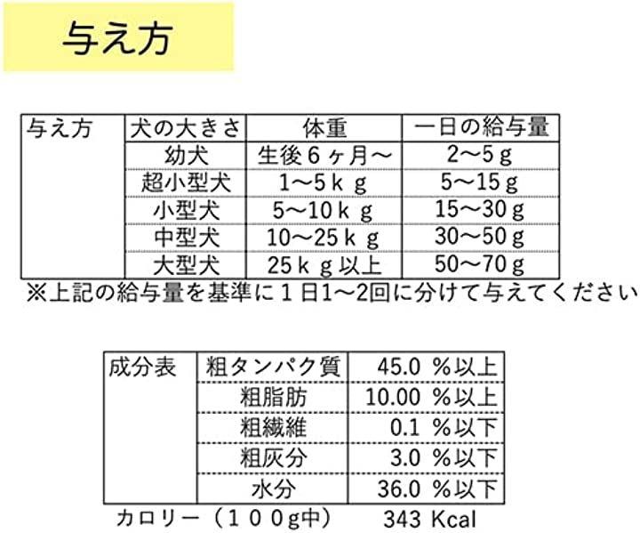 幼犬生後6か月から 2~5g、超小型犬1~5KG 5~15g、小型犬5~10KG 15~30g、中型犬10~25KG 30~50g、大型犬25KG以上 50~70g、給与量を基準に1日1~2回に分けて与えて下さい。