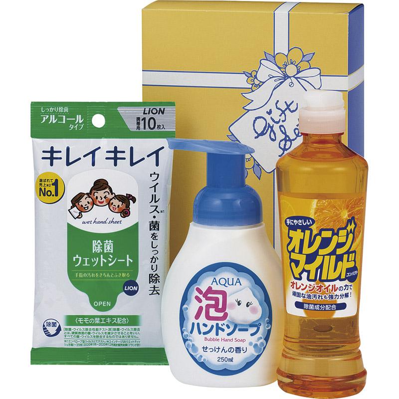 〇商品仕様●内容:オレンジマイルドコンパクト:270mL・泡ハンドソープ:250mL・ライオンキレイキレイお手ふきウエットシート(アルコールタイプ)10枚入×各1規格