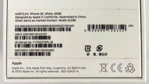 【品番】 MX9T2J/A【商品名】 Apple iPhone SE 第2世代 64GB【IMEI】 356786116000450【利用制限】 ○【OS】 iOS 18.6【付属品】 箱・冊子類・SIMピンLightningケーブル・ACアダプタ・イヤホンお買い上げされた商品の初期不良に伴って発生した各種損害につきましては、一切の責任を当社は負いかねます。上記内容をあらかじめご了承ください。[ジャンク品・ジャンク扱い品の説明]ジャンク品:動作の確認が全くできないもの・不良品ジャンク扱い品:動作の確認が一部できないもの・一部不良品本来の商品として成り立たない商品。傷・汚れ・折り目・割れ・劣化・改造・変形・破損等のダメージがある物になります。クリーニング・メンテナンスはしていません。