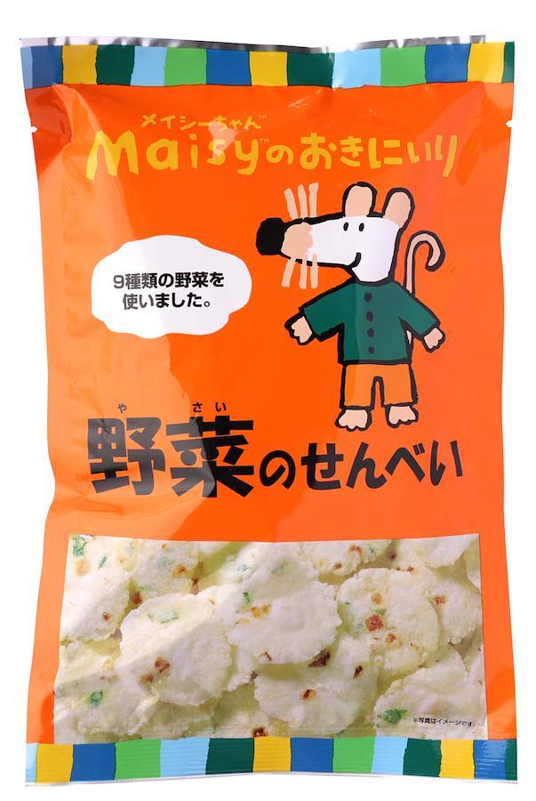 メイシーちゃんのおきにいりシリーズは原材料のもつ自然なおいしさにこだわりました。9種類の野菜を使った野菜たっぷりのおせんべいです。素材の甘みを活かしたおいしさです。国内産野菜使用。国内産馬鈴薯澱粉使用。砂糖は北海道産てんさい糖使用。メイシーちゃんといっしょに楽しいおやつタイム! 対象年齢(目安):2才頃から。