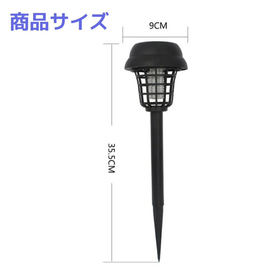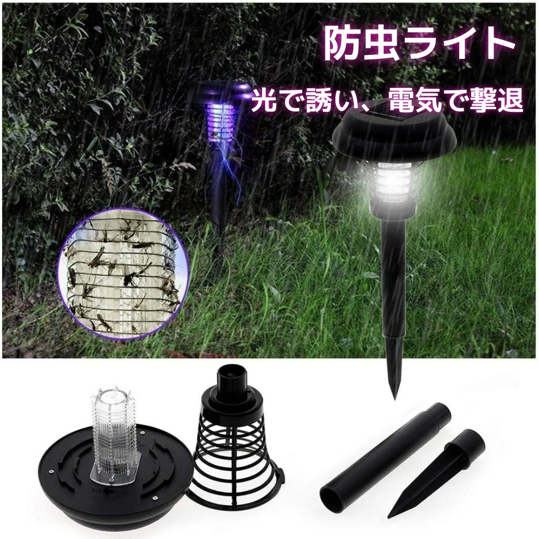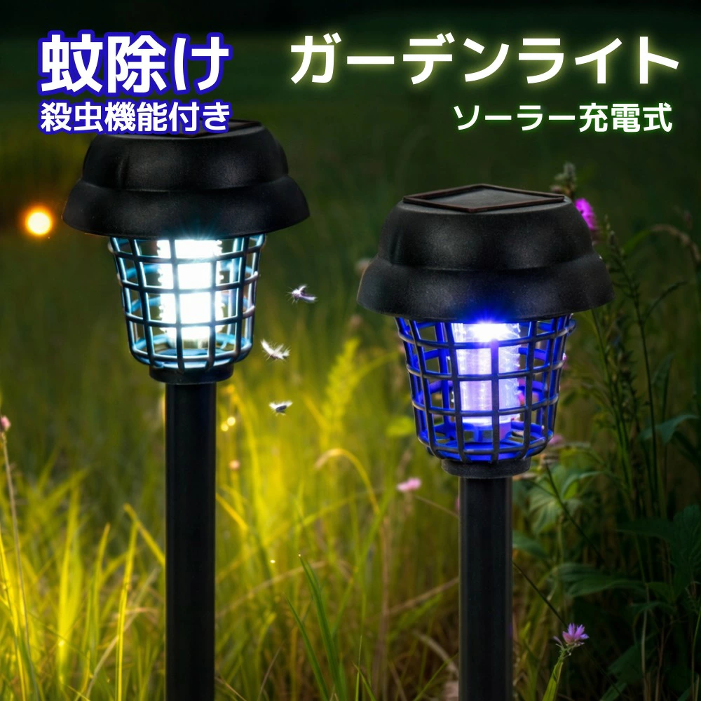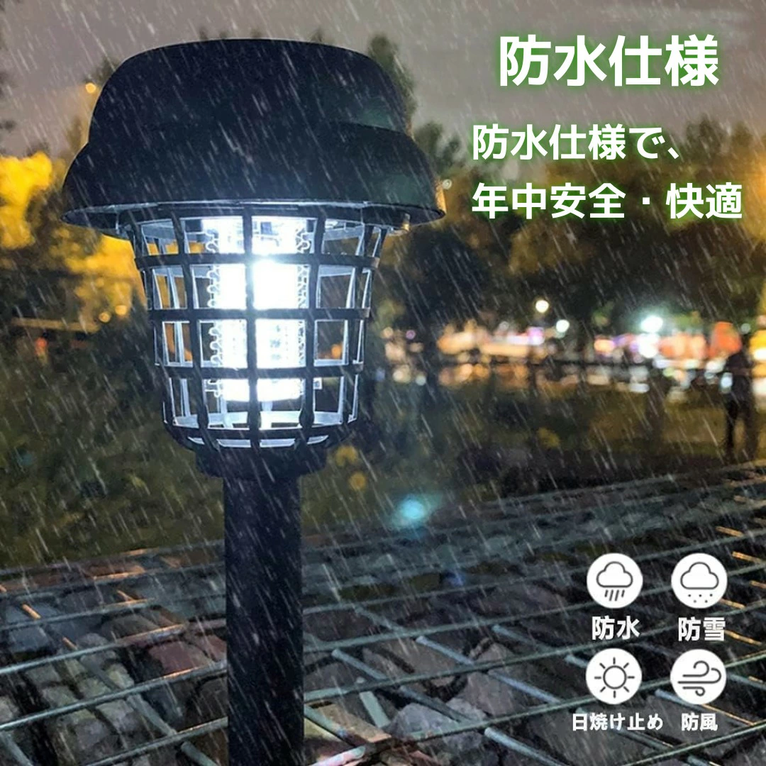 昼間に太陽光で自動充電し、暗くなると自動点灯。やさしいLEDライトで足元を照らしながら、光に集まる虫を電撃で撃退します。