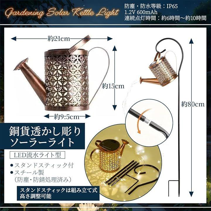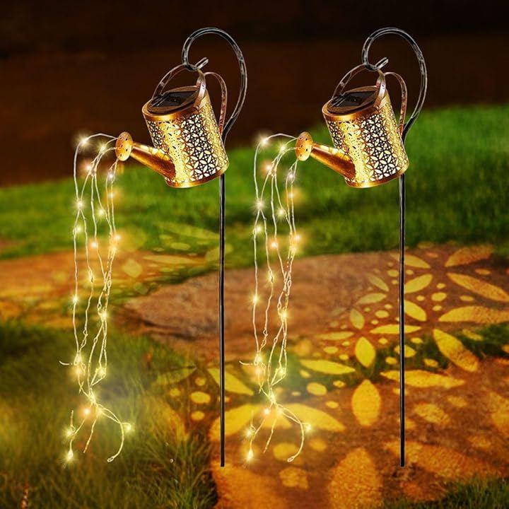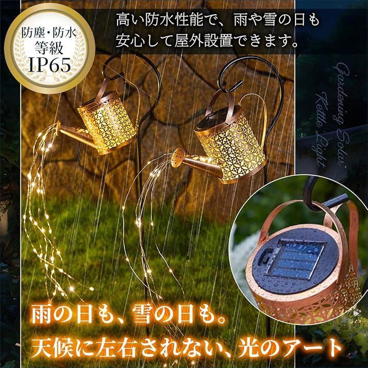幻想的な光で庭をおとぎ話の世界に まるで星屑が流れ落ちるように輝くソーラーガーデンライトは、じょうろからあふれる光が花や芝生を包み込み、おとぎ話のような雰囲気を演出します。