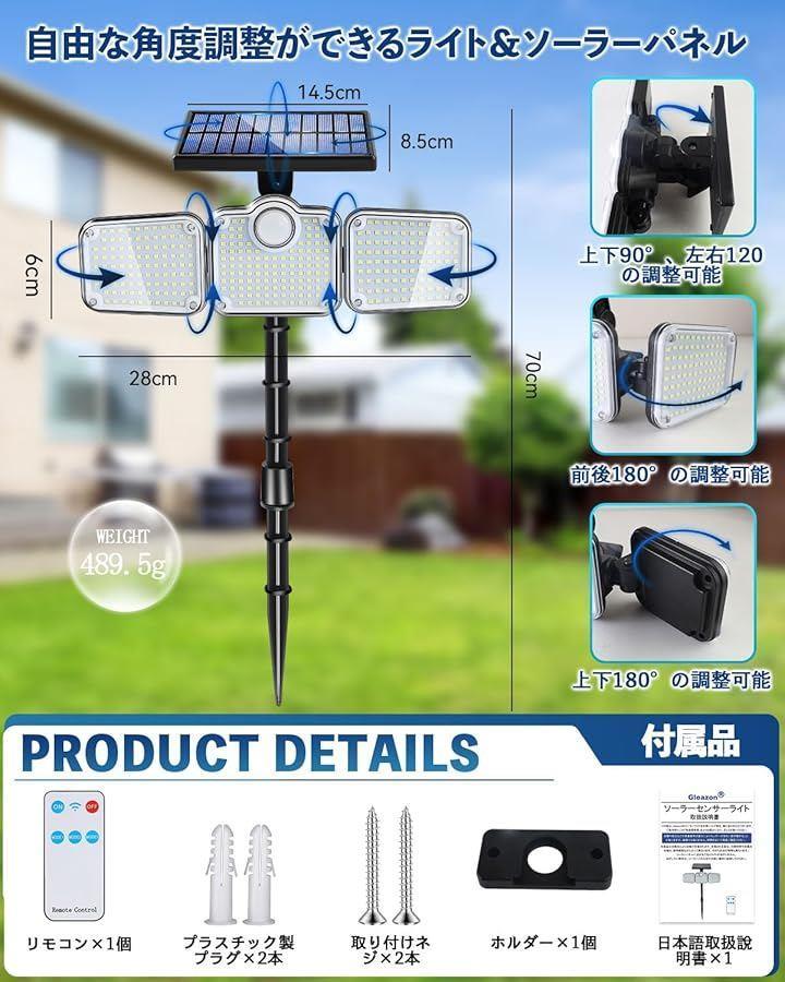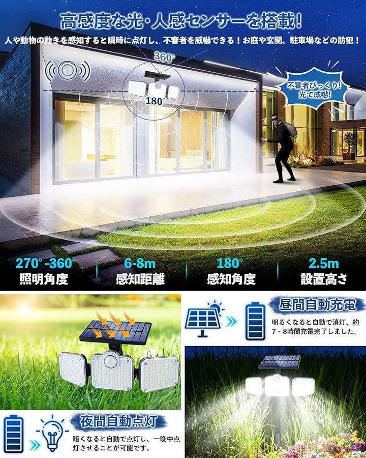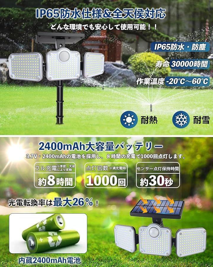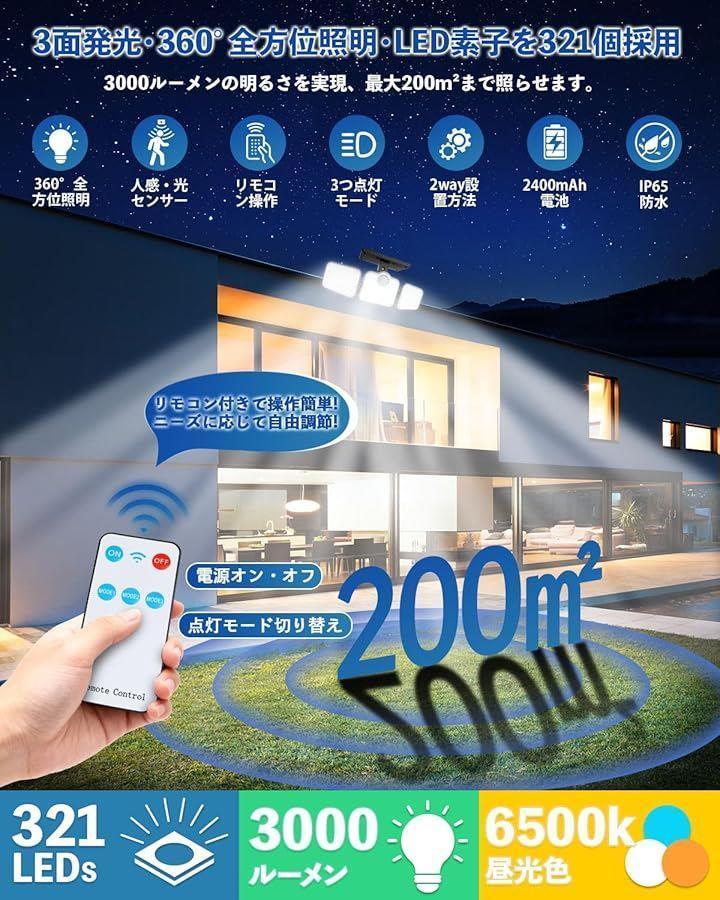 「新登場321個高輝度LEDs・抜群明るさ・3面発光・360°照明・角度調整可能」このLEDソーラーライトは超高輝度の321個の超高輝度LEDチップを搭載し、最大3000ルーメンの明るさでお庭や玄関先、ガーデン、街路、駐車場などをしっかり照らします。