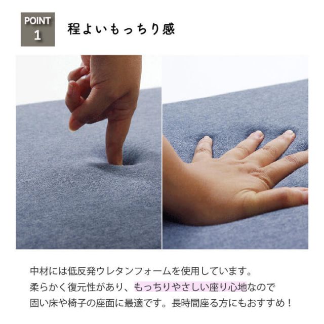 表地にニット素材を使用したクッションです。伸縮性があり、季節を選ばず年間ご使用いただけるようにしました。お部屋の雰囲気を崩しにくく使いやすい商品です。