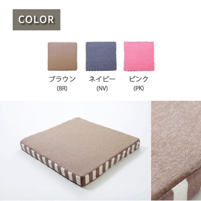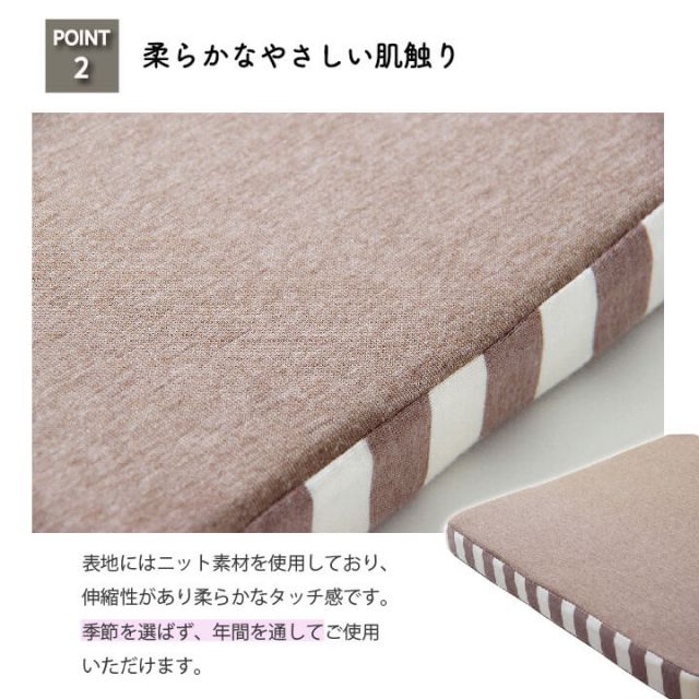 表地にニット素材を使用したクッションです。伸縮性があり、季節を選ばず年間ご使用いただけるようにしました。お部屋の雰囲気を崩しにくく使いやすい商品です。