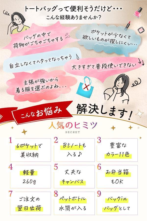 ?【 荷物が見つけられないトートとバイバイ! 】 3つの仕切りと2つのポケットで、収納した荷物が2秒で取り出せるのがこのバッグの一番の推しポイント。 トートバッグってカワイイけど、意外と不便な一面もありますよね。 そんなお悩みを解決するこのバッグでストレスレスなお出かけを楽しみましょう。?【 小ぶりなのに意外と入るんです 】 このトートバッグは、トートの中では小さめの部類に入るかもしれません。 でも心配なかれ。大きめトートにも負けずに意外と入ります。 女性はちょっとしたお出かけでも必要なものが多いですよね。 そんなニーズにもしっかりこのバッグは応えます。?【 どんな目的にもピッタリ合っちゃう! 】 ちょっとしたお出かけからマザーズバッグ、仕事用のバッグインバッグまで、どんな使い方にも対応できる汎用性も魅力。 それぞれの用途に応じてカラーを変えるとオシャレ度もアップ!?【 SORASIONのこだわり 】 SORASIONは商品に絶対の自信を持っています。だから安心の90日返品保証をさせていただいております。 皆様に喜んで、安心して商品を使っていただきたい。それが弊店スタッフ全員の願いです。 初期不良やご満足いただけない点がございましたら、ご遠慮なく返品交換をお申し付けくださいませ。?【 プレゼントとしても喜んでいただいています 】メイン素材: キャンバス サイズ:横23.0cm×縦21.0cm×マチ15.0cm×持ち手30.0cm ※平置き採寸のため若干の誤差はご容赦ください。 商品重量:約350g 【仕様】大スペース×1、中スペース×1、小スペース(ペットボトル)×1 内側ポケット×2、外側ポケット×1