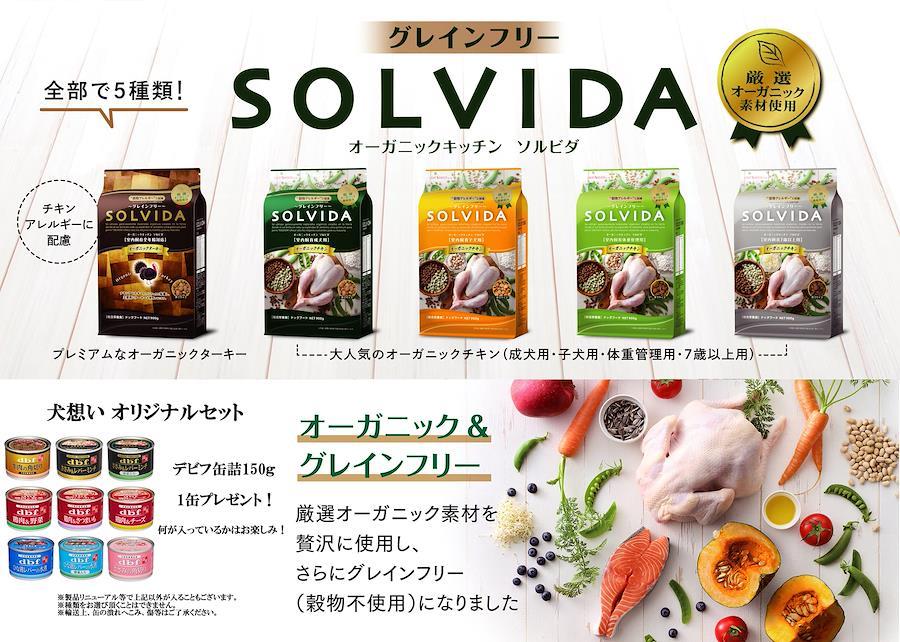グレインフリーのプレミアムドッグフード ソルビダは、今まで以上に原材料にこだわりました。本来は肉食動物であるワンちゃんの為に全シリーズの原材料をグレインフリー(穀物不使用)とし、食物アレルギーを心配されているワンちゃんにも安心して与えていただけるようにしました。 ●ワンちゃんにいつまでも元気でいて欲しいから、ソルビダは食材、栄養バランス、安全性にこだわりました。 素材そのもののおいしさを生かしているので、ドライフードが苦手なワンちゃんでも、食事の時間が楽しみになる抜群の嗜好性です。 ●毎日一生食べるものだから、安全性にとことんこだわり、主原料にオーガニック食材を使用しました。