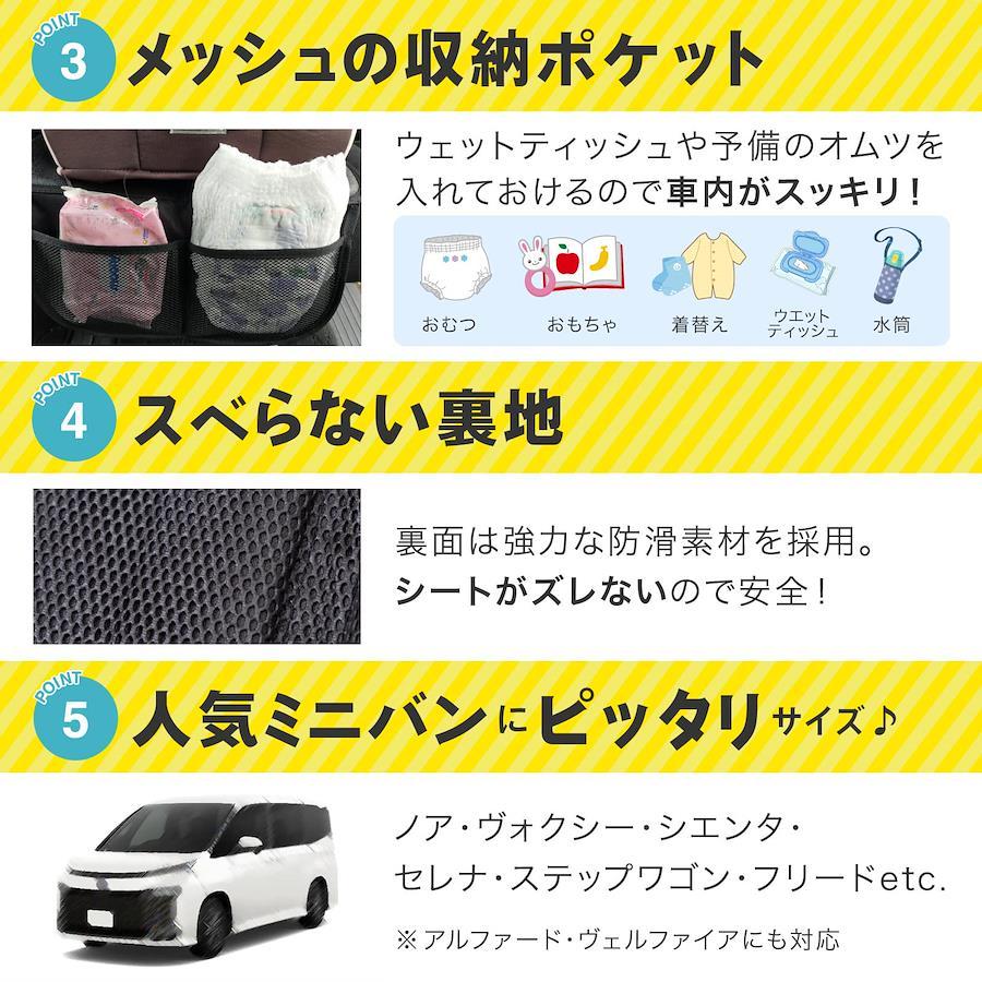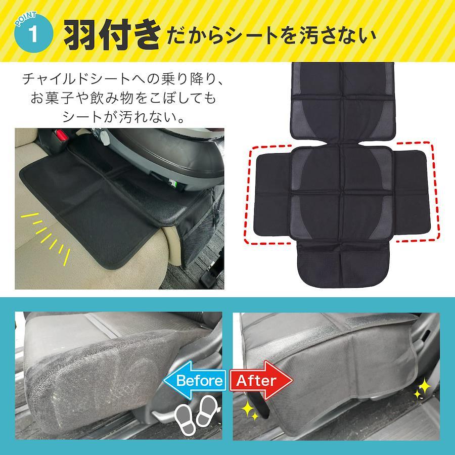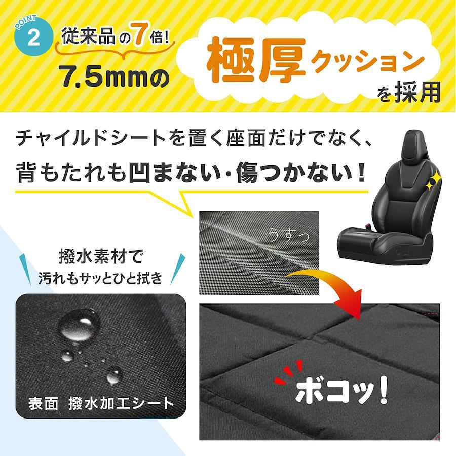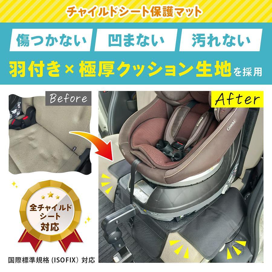【保育士推奨】乳幼児や未就学児童の保育のプロである現役ベテラン幼稚園教諭が推薦するチャイルドシート保護マット 【サイドもガード】羽根付きデザインのチャイルドシート 保護マット なのでシートのサイド・横も汚れからガードできます。横から乗っても大丈夫。食べこぼしもカバーします。 【極厚クッション生地】厚さ7.5ミリのクッション生地を採用。チャイルドシート、ジュニアシートによる凹みから愛車を守ります。車シートの座面だけでなく背もたれ部分も凹まない・傷つかない。裏地は滑り止め付き。 【ミニバンにもジャストサイズ】子育て世代に人気のミニバンのシートにもピッタリサイズのチャイルドシートカバー。軽自動車もOKです。【サイズ】背面: 58cm*46cm / 座面: 43cm*47cm 【ISOFIX対応】全てのチャイルドシートの保護に対応するデザインとサイズ感。国際基準のISOFIX対応。