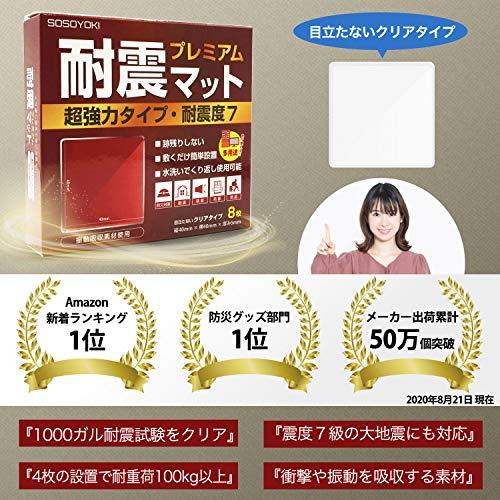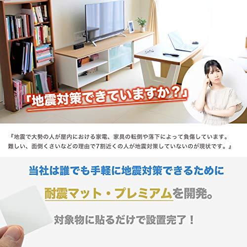 【耐震マット・プレミアム】1000ガル耐震試験をクリア、震度7クラスの大地震にも対応。4枚の設置で耐重荷100kg以上(一枚あたり25kg)耐荷重トップレベル。【振動吸収素材使用】振動吸収率90%以上、-20℃~75℃の環境で使用可能、厚さ5mmで多少の凸凹があっても密着。プリンターや機械類から発せられる振動・騒音の低減にも効果を発揮。【くり返し使用可能】何度も貼り直し可能。きれいにはがせるので接着面を痛めず、汚れた時は水洗いで自然乾燥すれば、粘着力復活し、くり返し使用可能。耐久性が抜群。【簡単設置】家電、家具、置物など使い方いろいろ、両面粘着タイプでしっかり固定、工事不要、敷くだけ簡単設置。【選べるサイズ】目立たないクリアタイプ四角40mm/70mm。用途や設置面に合わせて選択可能。