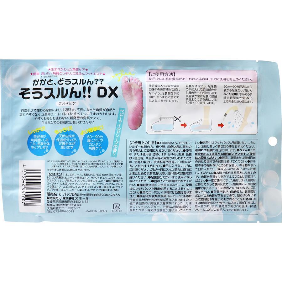 進化した角質フットケア!簡単、速い!角質ごっそり、ぷるるんフットエステ!●日常生活で生じる摩擦により、1週間後、不要になった角質が自然と取れやすくなり、2週間後にはつるつる・すべすべに生まれかわります。●やすりも軽石も使わない、新発想の角質ケアで、生まれたてのお肌に出会いませんか?●しっかり!美容液が角質層にしみこみ、足裏全体をケアします。●もっちり!天然由来の保湿成分で、足裏全体が潤います。●より簡単に!60~90分履くだけでカンタン角質ケア。●ベビーマイルドソープの香り。●対応足サイズ:27cmまで。※使用後の状態には、個人差があります。