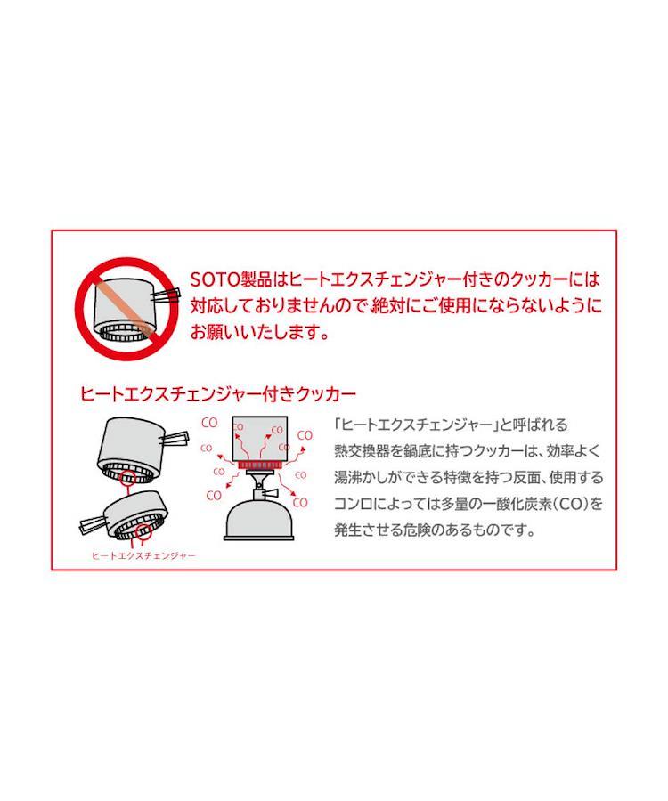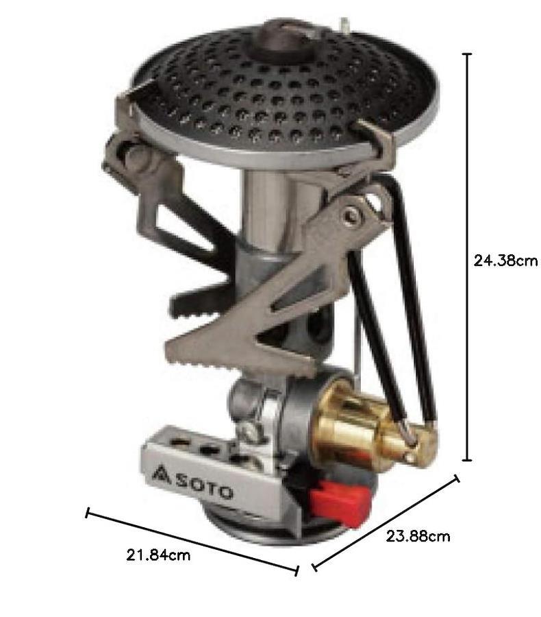 原産国:日本材質:ステンレス、樹脂本体サイズ:幅9.6×奥行9.4×高さ8.6cm(使用時本体のみ)本体重量:73g収納時サイズ:幅5.2×奥行5.2×高さ8.1cm発熱量:3.3kW(2.800kcal/h) ※SOD-725T使用時 気温25度無風状態で点火後から5分間の燃焼データより算出。使用燃料:SOTO製品専用容器(OD缶)使用時間:約1.5時間(SOD-725T 1本使用時)、約0.68時間(SOD-710T 1本使用時) ※気温25度無風状態で点火後から30分間の燃焼データより算出。