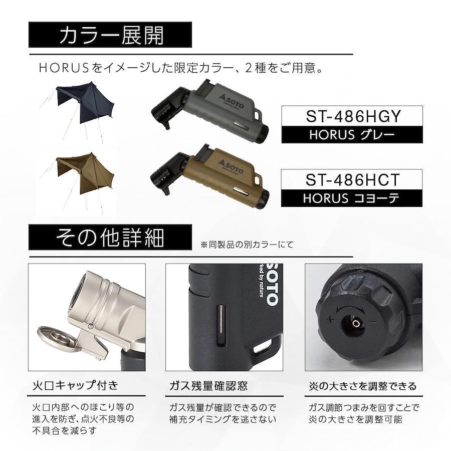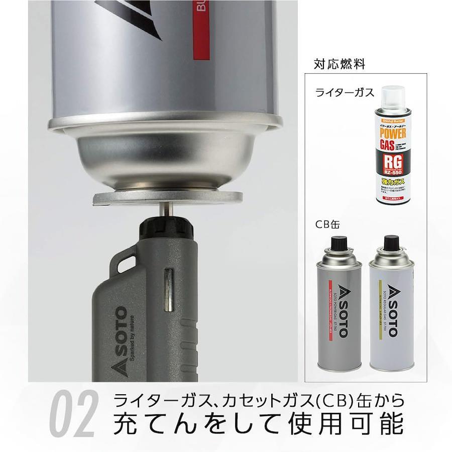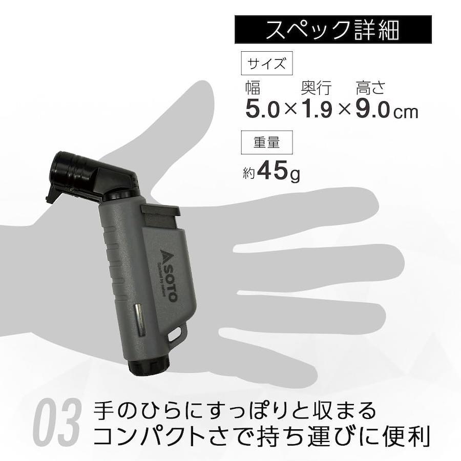サイズ:幅5×奥行1.9×高さ9cm本体重量:45g使用燃料:SOTO製品専用容器(ボンベ) [CB缶] (ST-760、ST-700)、ライター用ガスガス充てん量:約1.2g発熱量:0.09kW(80kcal/h)