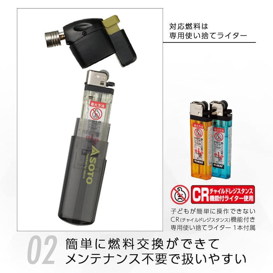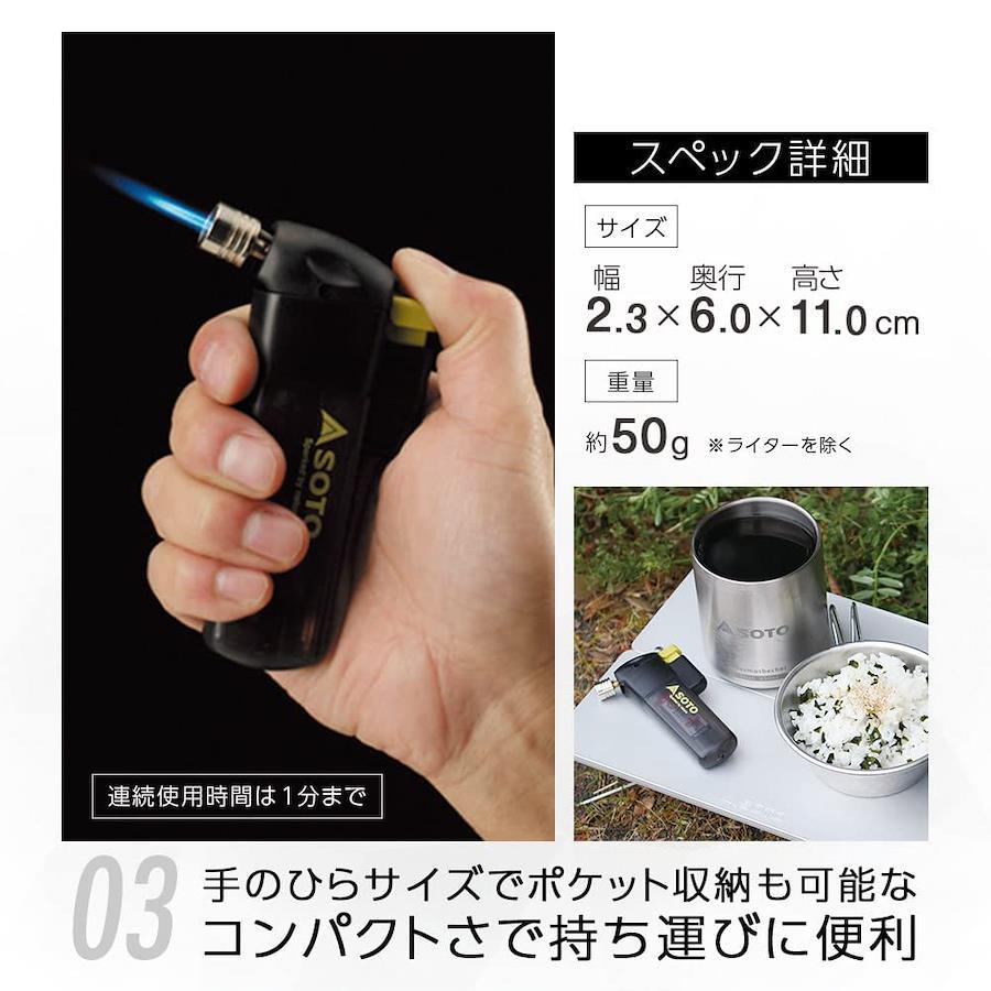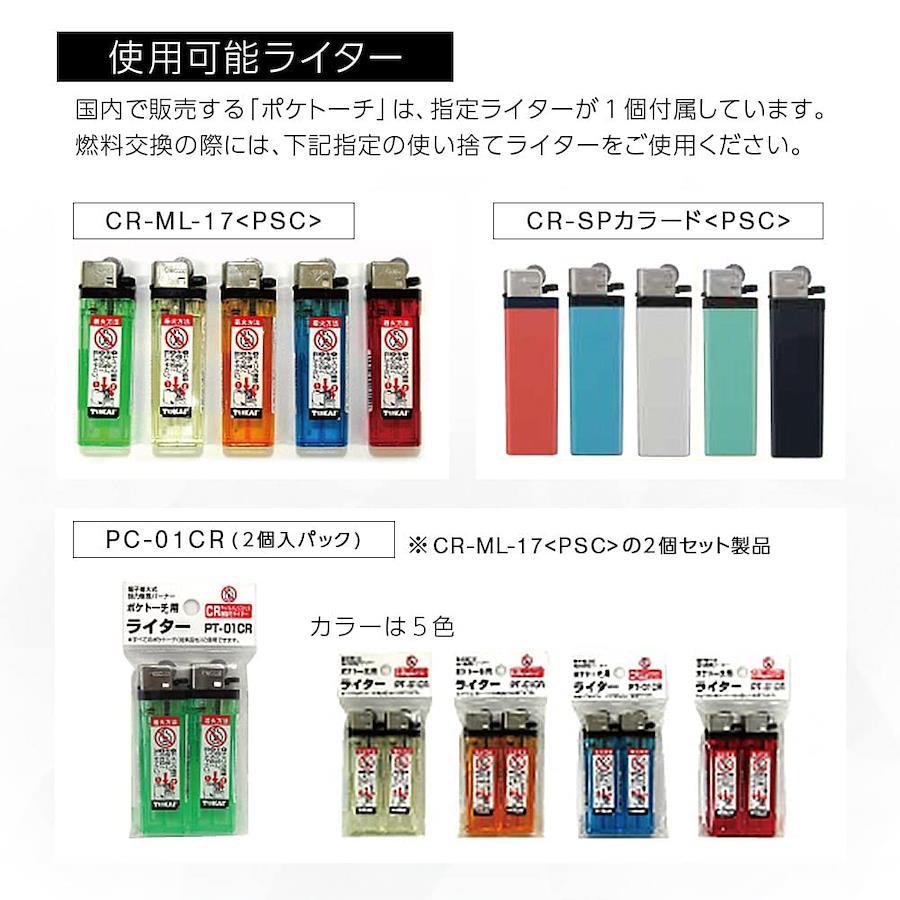 本体サイズ:幅2.3×奥行6×高さ11cm本体重量:50g(ライターを除く)原産国:日本火口径:直径14mm炎温度:1300度炎サイズ:直径3×12mm炎形状:極細集中炎燃焼時間:約20分(ライター1個)連続使用時間:1分未満使用燃料:市販の使い捨てライター(使用可能ライター/CR-ML-17[PSC]・CR-SPカラード[PSC])