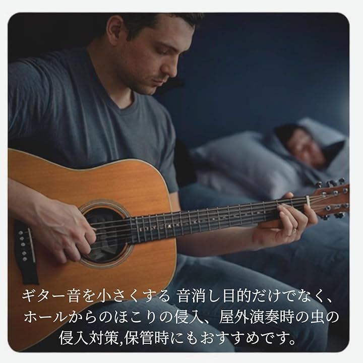 「夜間練習が可能」このサウンドホールカバーを使用することで、アコースティックギターの音量を効果的に抑え、夜間でも周囲を気にせず練習が可能になります。