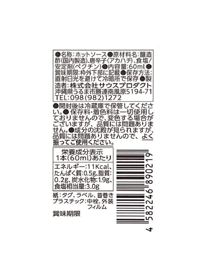 内容量:60mlカロリー:(100gあたり)20.5Kcal原材料:醸造酢、唐辛子(アカハチ)、食塩、安定剤(ペクチン)商品サイズ(高さx奥行x幅):136mmx37mmx37mm【重要】メーカーによる商品リニューアルに伴いパッケージ(内容量も含む)変更が行われた場合、新パッケージでお届け致します事ご了承願います。