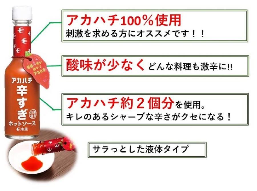 世界でもトップクラスの激辛唐辛子であるハバネロの約5倍の辛さを持つ新種の唐辛子“アカハチ"が石垣島で誕生しました。激辛なのにキレのあるシャープな辛味が特徴のアカハチを贅沢に使用したホットソース。辛さはタバスコの20倍の辛さを記録しました!いつもの辛さでは満足できない、刺激を求める激辛党の方にオススメです。少ない量でも風味を変えることなく料理の味を引き締めます。ピザやパスタはもちろん、タコスやカレーなど辛い料理に直接かけてお召し上がれます。ホットソース2、3滴でお子様カレーが激辛大人のカレーに早変わり! 辛さが物足りない時にオススメです。
