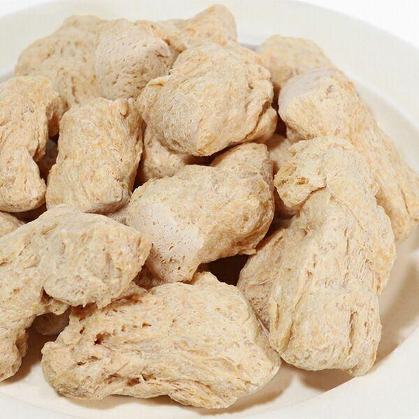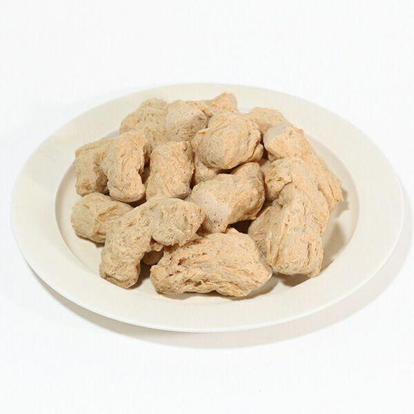 ■原材料名:エンドウたん白、粉末状大豆たん白(非遺伝子組換)、食物繊維(大豆・非遺伝子組換)、脱脂大豆(非遺伝子組換)、でん粉(とうもろこし・非遺伝子組換)