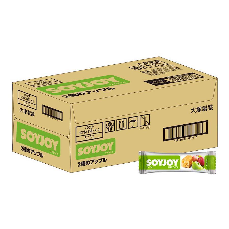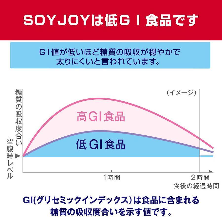 SOYJOYは、小麦粉を使用せず大豆を粉にした生地にたっぷりのフルーツやナッツ、チョコレートを加えて焼き上げた新しいタイプの栄養食品です。大豆とフルーツやナッツ、チョコレートがぎっしり詰まっていてこぼれおちにくく大豆タンパク質やイソフラボン、ミネラルなど、素材由来の栄養素をおいしくスマートに摂る事ができます。さらに、糖質の吸収がおだやかで、太りにくいと言われている「低GI食品」です。大豆をまるごと粉にして生地に使用。(うすかわを除く)2種の味わいの異なるアップルたっぷり