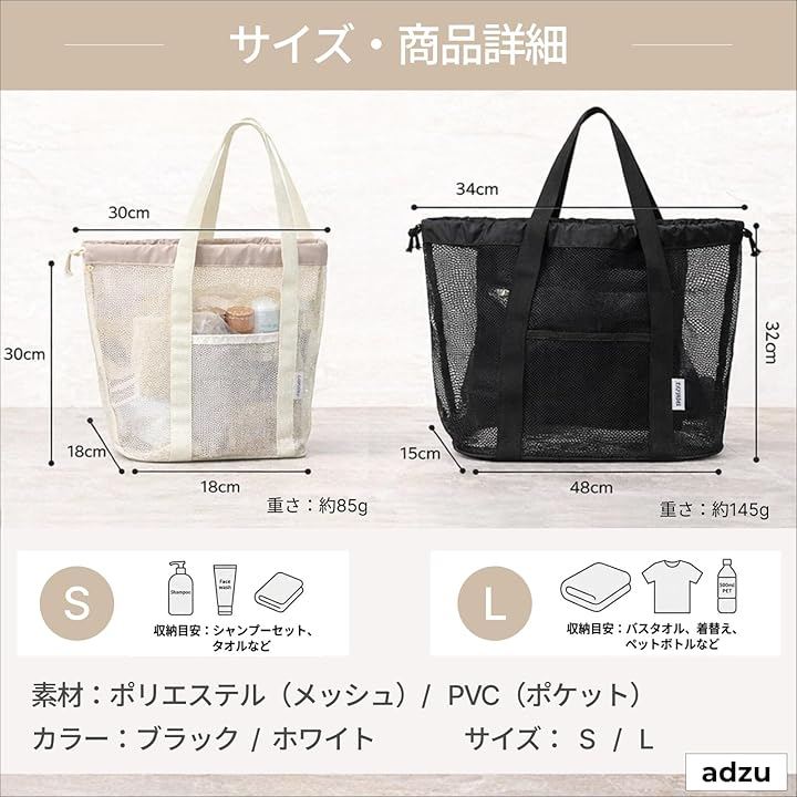 「素材・サイズ・基本仕様」 素材:PVC、ポリエステル Sサイズ:約底18x18cm、高さ30cm、上辺30cm、重量約85g Lサイズ:約底48x15cm、高さ32cm、上辺34cm、重量約145g カラー:ブラックS/ブラックL/ホワイトS/ホワイトL