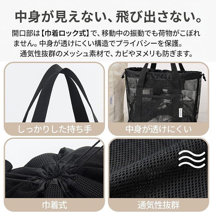 巾着ロックが中身をしっかり保持し、振動の多い移動でも荷崩れしにくいのが特徴です。