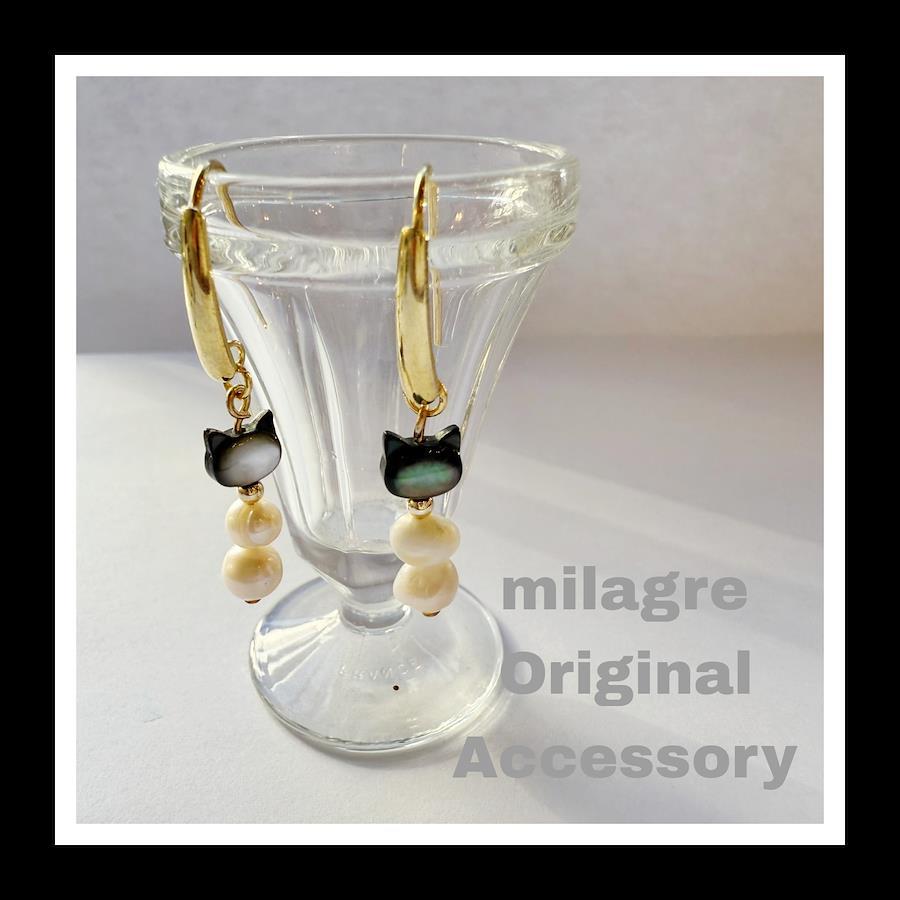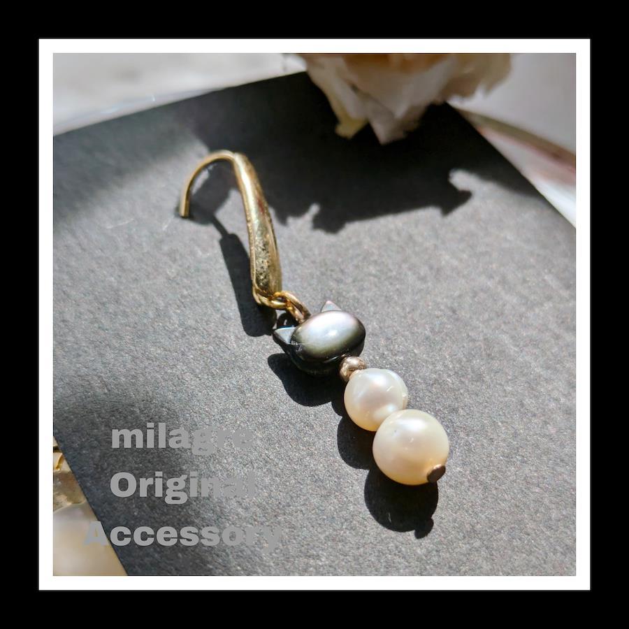 💎黒猫・淡水パールPierce💎金具 Stainless(Gold)天然石(淡水パール・シェル)Size 6cm/9g