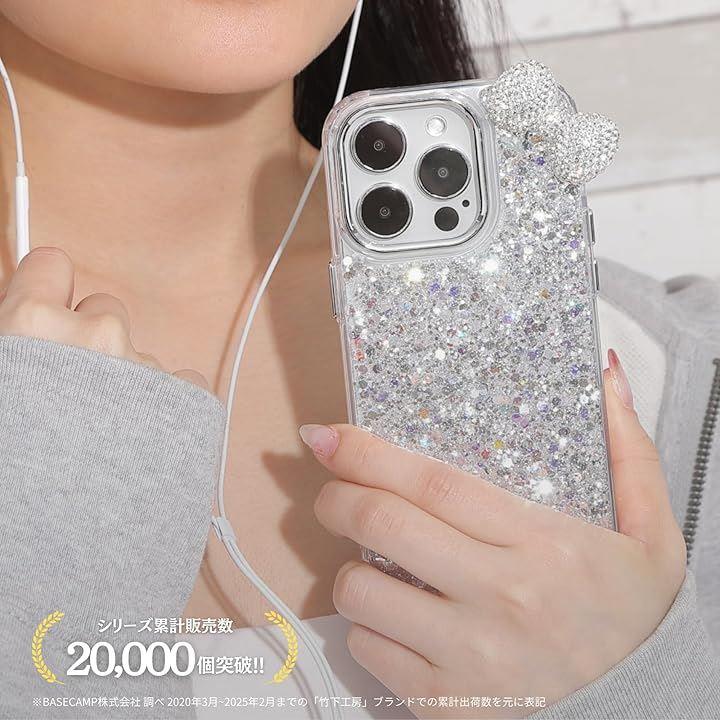 「ぎっしりラメx立体リボンのキラキラリボンケース」 ケース全体に大小さまざまなストーンとラメをびっしりと敷き詰め、角度を変えるたびにまばゆい輝きを放つラグジュアリーなデザイン。