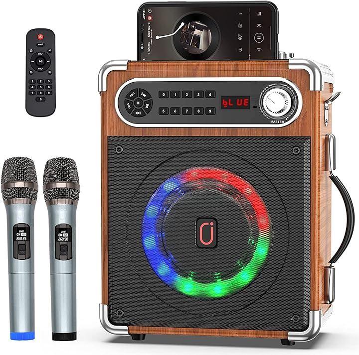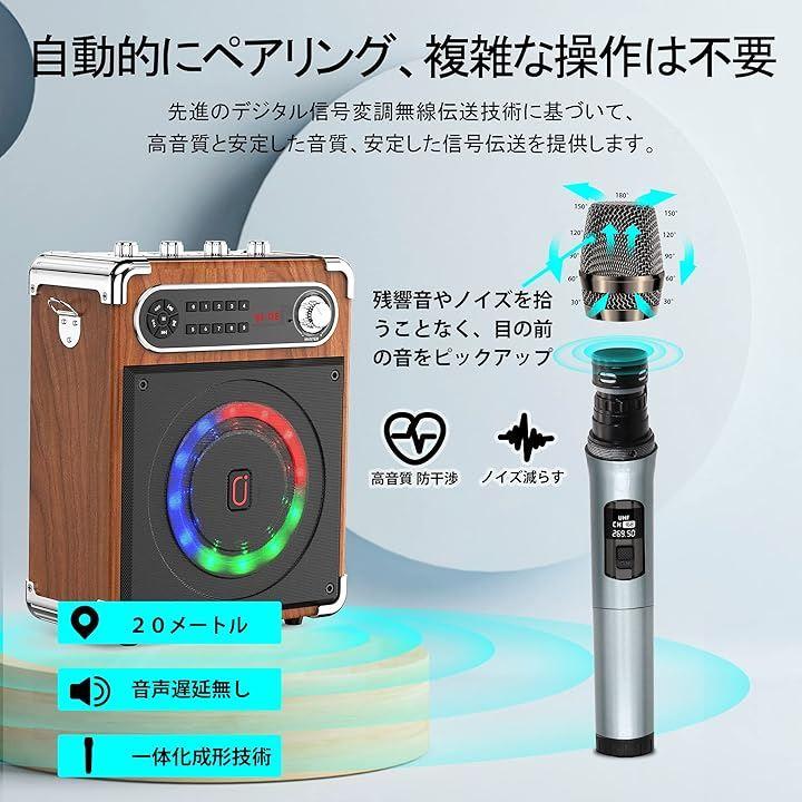 Portable, rechargeable speaker set with Bluetooth 5.0, loudspeaker, two wireless microphones, and enhanced bass and treble.