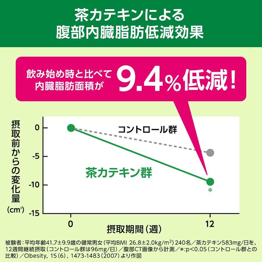 【許可表示】本品は、脂肪の分解と消費に働く酵素の活性を高める茶カテキンを豊富に含んでおり、脂肪を代謝する力を高め、エネルギーとして脂肪を消費し、内臓脂肪を減らすのを助けるので、内臓脂肪が多めの方に適しています。食生活は、主食、主菜、副菜を基本に、食事のバランスを。