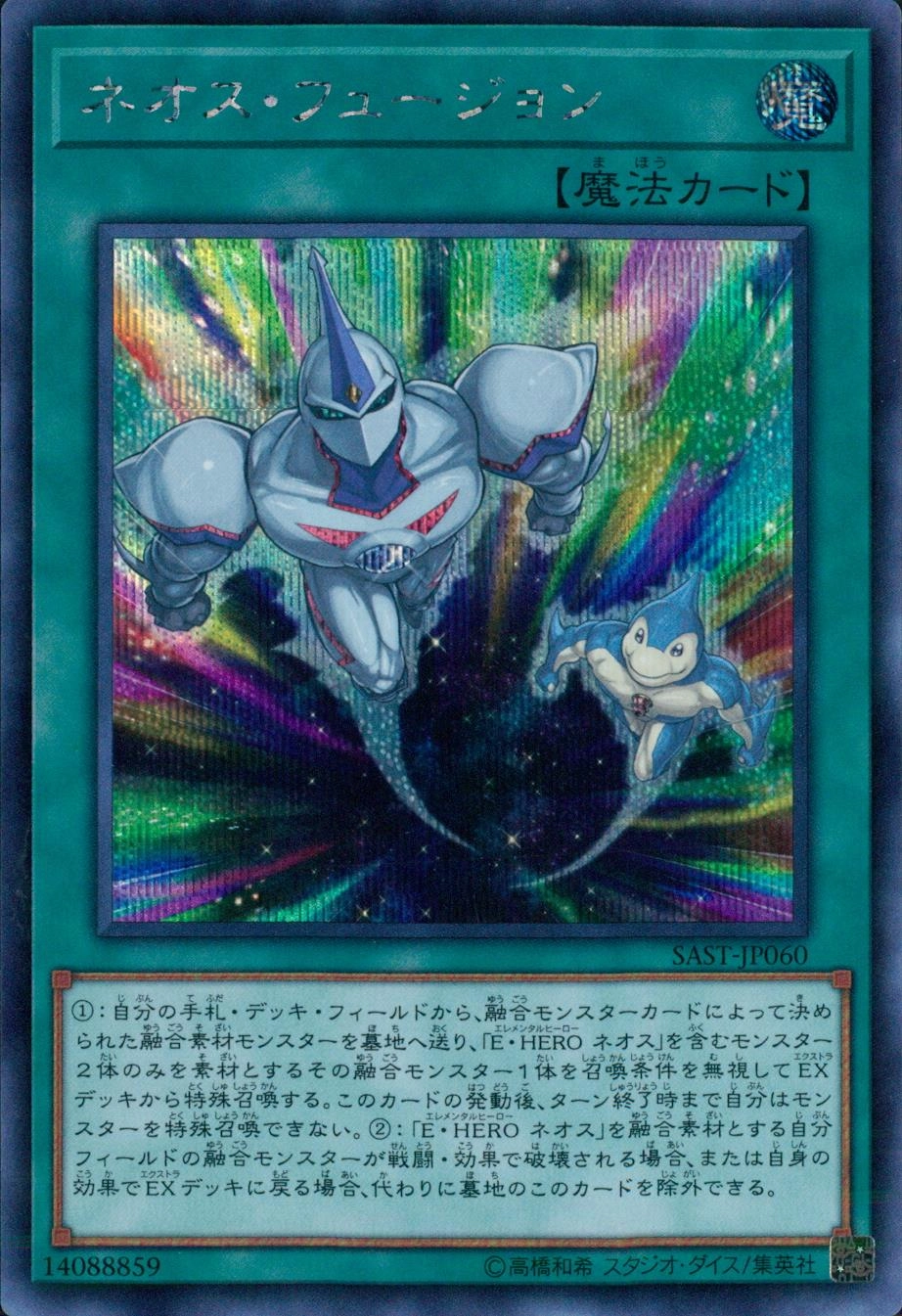 ■発売年月日1918/10/21搭載パック[SAST]SAVAGE STRIKE収録基本パックレアリティシークレットレア種類通常魔法属性-種族-星(レベル、ランク)‐攻撃力‐守備力‐リンク‐リンク方向‐ペンデュラムレフト‐ペンデュラムライト‐シリーズ第10期効果テキスト①:自分の手札・デッキ・フィールドから融合モンスターカードによって決められた融合素材モンスターを墓地へ送り、「E・HERO ネオス」を含むモンスター2体のみを素材とするその融合モンスター1体を召喚条件を無視してEXデッキから特殊召喚する。このカードの発動後、ターン終了時まで自分はモンスターを特殊召喚できない。②:「E・HERO ネオス」を融合素材とする自分フィールドの融合モンスターが戦闘・効果で破壊される場合、または自身の効果でEXデッキに戻る場合、代わりに墓地のこのカードを除外できる。ペンデュラムテキスト-■商品ランクについてA:中古品で比較きれいな商品です。コレクター向きではございません。B:カジュアルプレイ向きです。削れやめくれ、傷などがある場合がほとんどです。