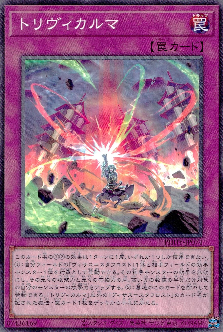 ■発売年月日2022/10/15搭載パック[PHHY]PHOTON HYPERNOVA収録基本パックレアリティノーマル種類通常罠属性-種族-星(レベル、ランク)‐攻撃力‐守備力‐リンク‐リンク方向‐ペンデュラムレフト‐ペンデュラムライト‐シリーズ第11期効果テキストこのカード名の①②の効果は1ターンに1度、いずれか1つしか使用できない。①:自分フィールドの「ヴィサス=スタフロスト」1体と相手フィールドの効果モンスター1体を対象として発動できる。その相手モンスターの効果を無効にし、その元々の攻撃力と元々の守備力の内、高い方の数値の半分だけ対象の自分のモンスターの攻撃力をアップする。②:墓地のこのカードを除外して発動できる。「トリヴィカルマ」以外の「ヴィサス=スタフロスト」のカード名が記された魔法・罠カード1枚をデッキから手札に加える。■商品ランクについてA:中古品で比較きれいな商品です。コレクター向きではございません。B:カジュアルプレイ向きです。削れやめくれ、傷などがある場合がほとんどです。