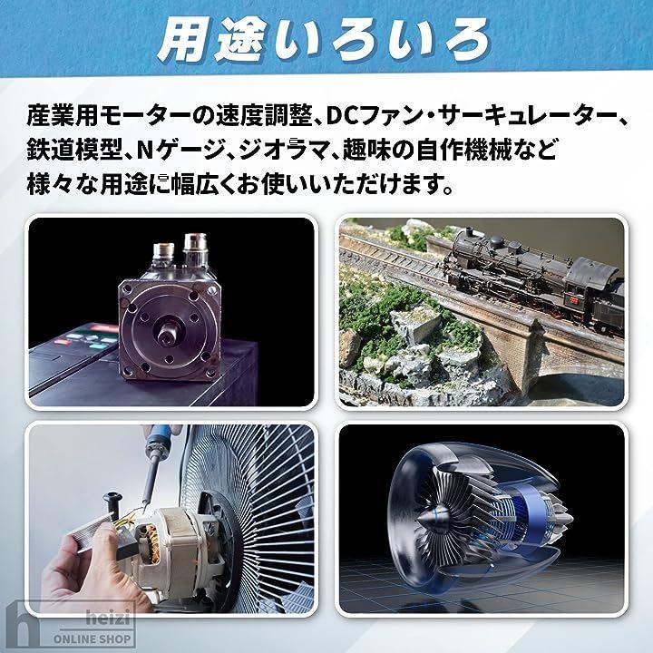 産業用モーターの速度調整、DCファン・サーキュレーター、鉄道模型、Nゲージ、ジオラマ、趣味の自作機械など様々な用途に幅広くお使いいただけます。