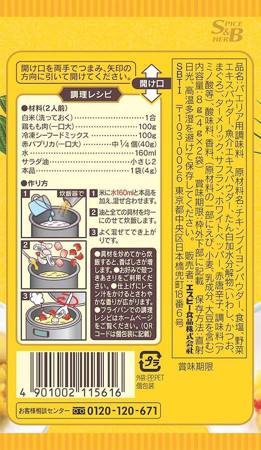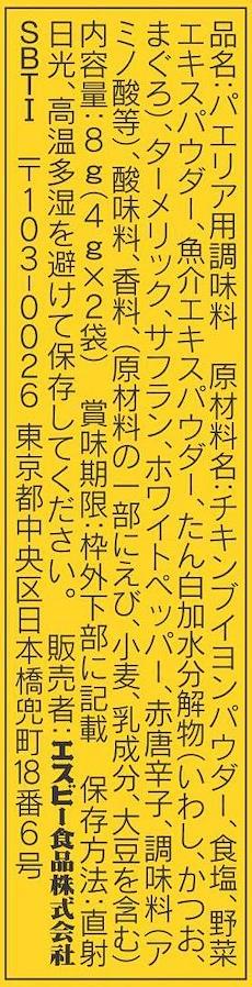 原材料:チキンブイヨンパウダー、食塩、野菜エキスパウダー、魚介エキスパウダー(えび、あさり)、たん白加水分解物(いわし、かつお、まぐろ)、ターメリック、サフラン、こしょう、赤唐辛子、調味料(アミノ酸等)、酸味料、香料、(その他小麦、乳、大豆由来原材料を含む)