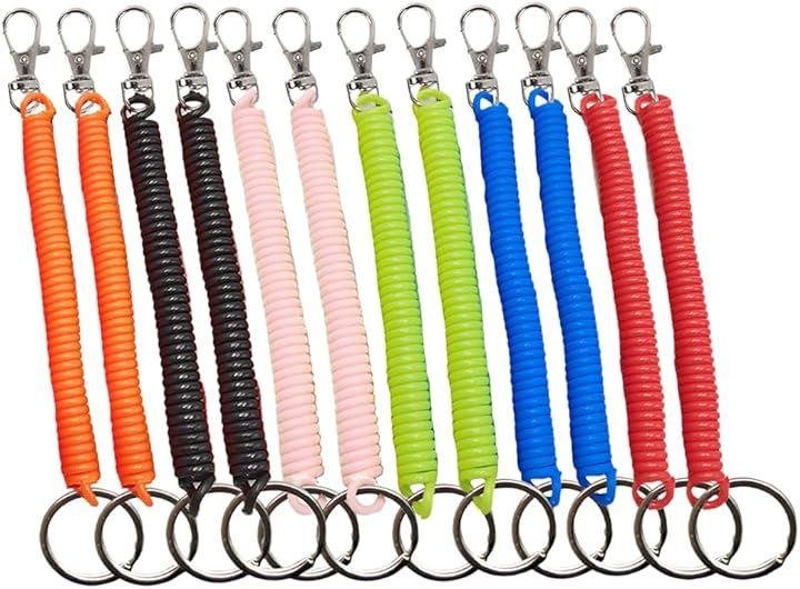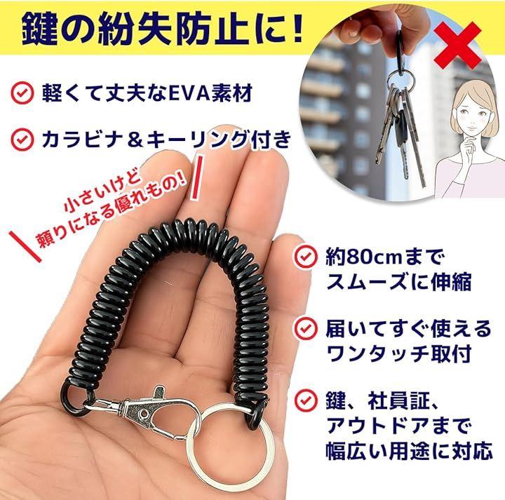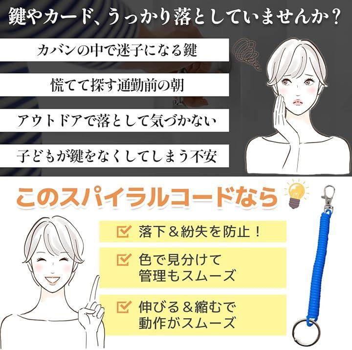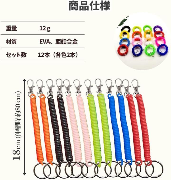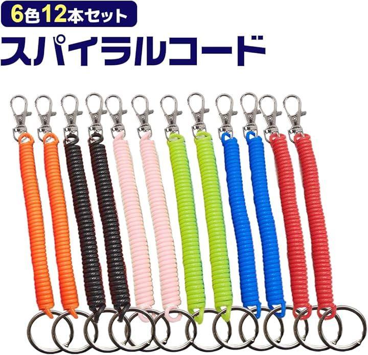 「家族みんなで使える。便利でカラフルな12本セット」毎日使う鍵やパスケースの「うっかり落下」を防ぐ、伸縮自在なスパイラルコードです。