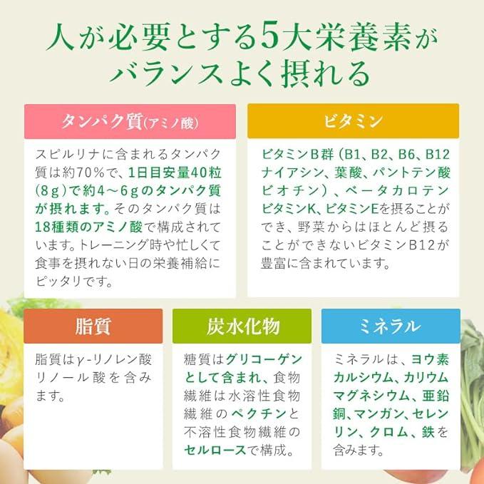 ■商品説明内容量 1200g (200mg×6000粒=1200g) 約5ヶ月分 製造国 日本製 賞味期限 3年 原材料 スピルリナ原末 使用方法 1日の目安量を数回に分けて水などでお召しあがりください。