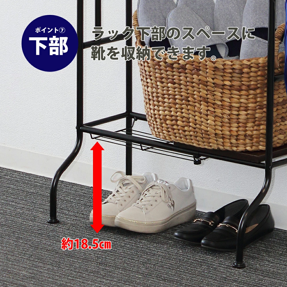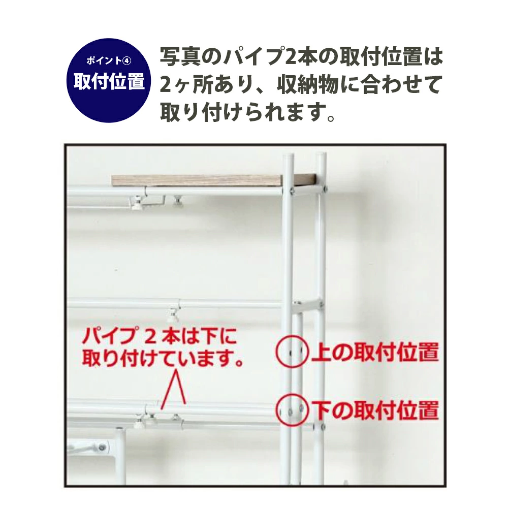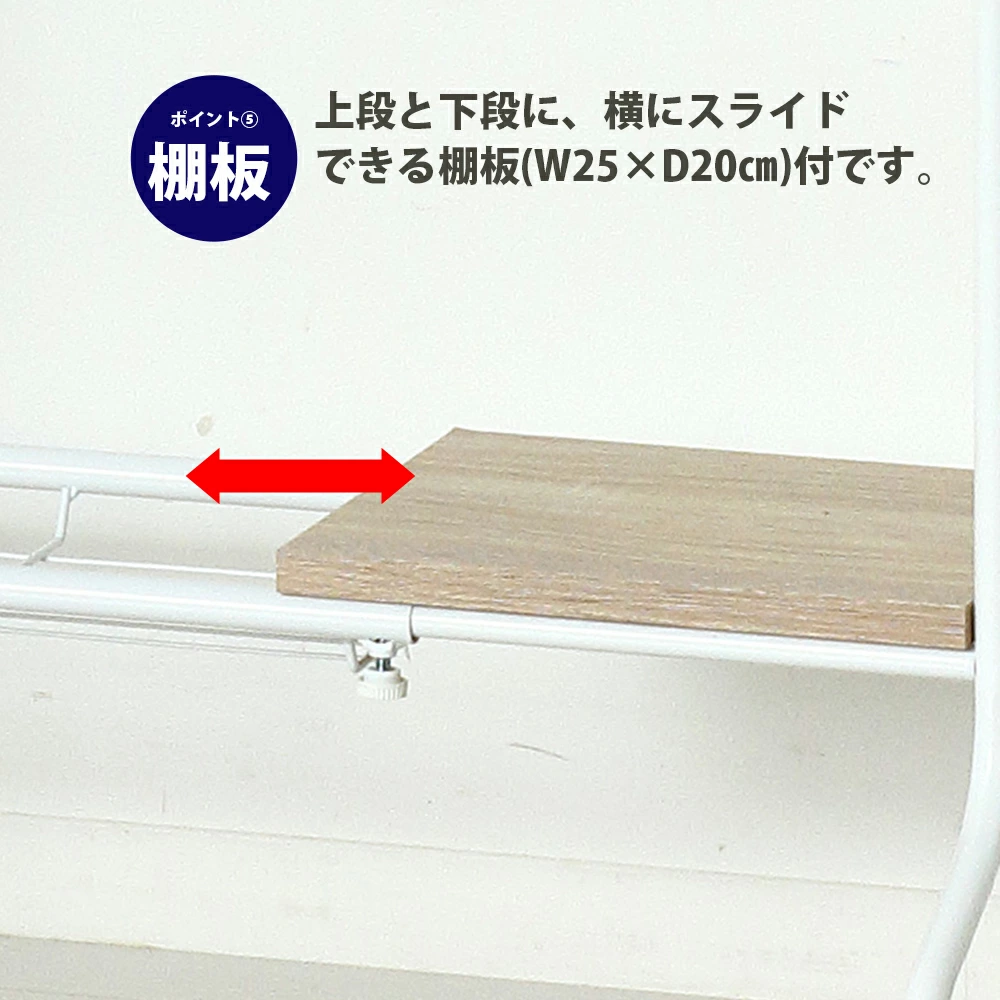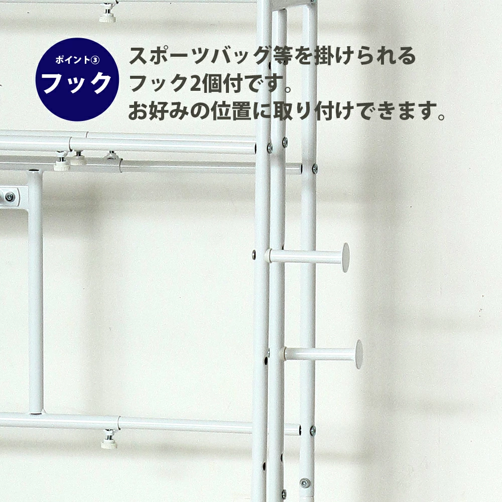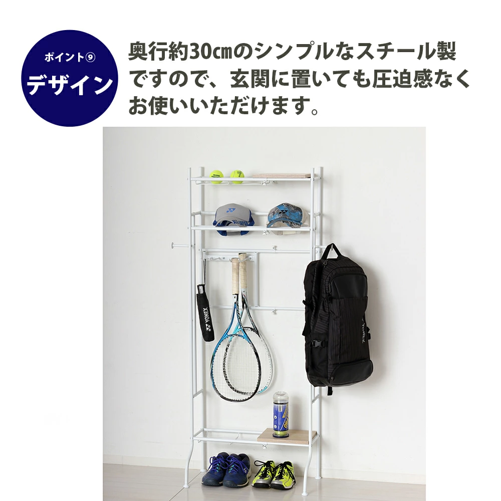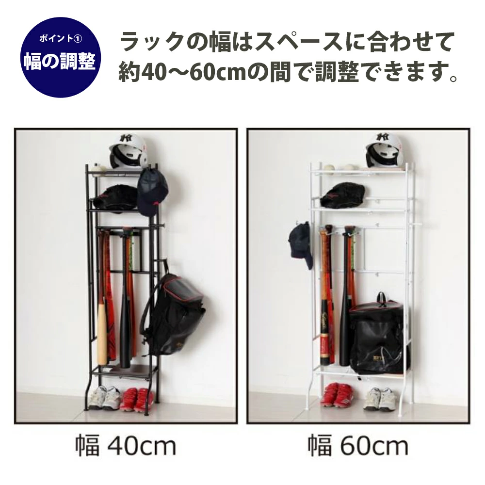 【商品情報】置き場所に困っていたスポーツ用品類をまとめてすっきり収納!ポイント1 幅の調整 ラックの幅はスペースに合わせて約40~60cmの間で調整できます。ポイント2 ロングフック 野球バットを最大で6本掛けられます。またスケートボードを掛けることもできます。ポイント3 フック スポーツバッグ等を掛けられるフック2個付です。お好みの位置に取り付けできます。ポイント4 取付位置 パイプ2本の取付位置は2ヶ所あり、収納物に合わせて取り付けられます。ポイント5 棚板 上段と下段に、横にスライドできる棚板(W25×D20cm)付です。ポイント6 アジャスター ガタつきを防止するアジャスター4個付です。ポイント7 下部 ラック下部(約18.5cm)のスペースに靴を収納できます。ポイント8 収納物 さまざまなスポーツ用品の他に、玄関収納としてもお使いいただけます。自転車用ヘルメットやお子様に外遊び道具など、お部屋に持ち込みたくない物の収納に便利です。ポイント9 デザイン 奥行約30cmのシンプルなスチール製ですので、玄関に置いても圧迫感なくお使いいただけます。ポイント10 カラー 玄関に合わせやすいホワイト/ナチュラルとブラック/ブラウンの2色展開です。