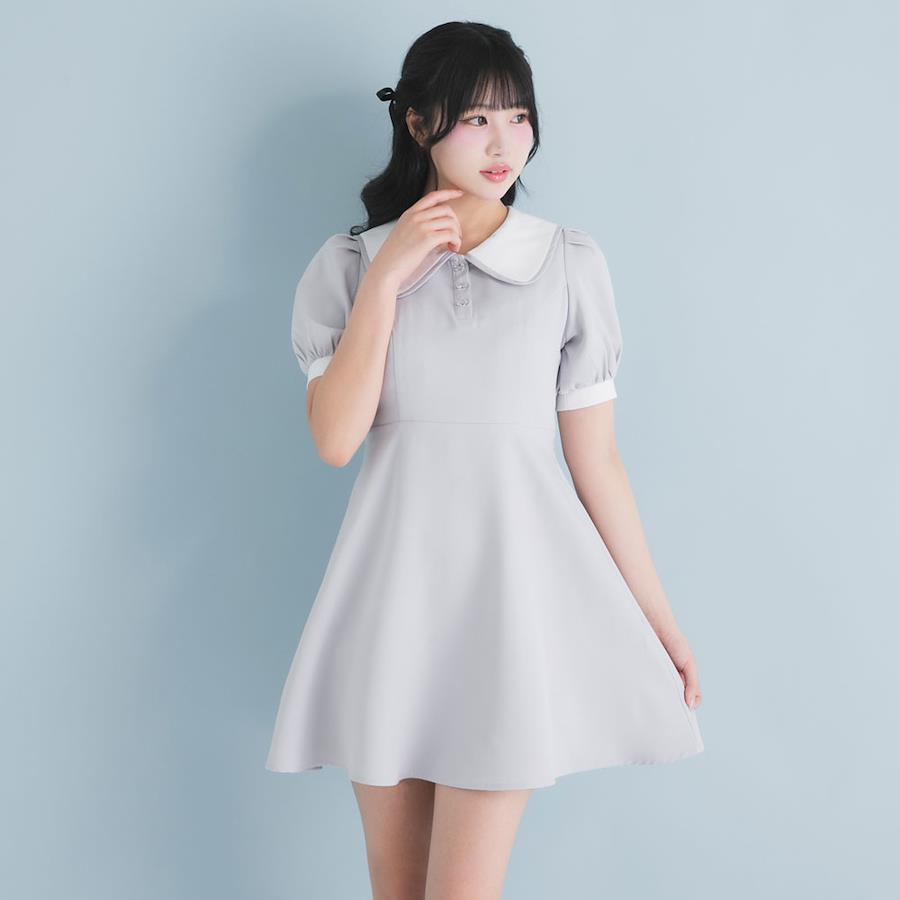 襟パイピングデザインと前立てのきらきらビジューリボンがアクセントの可憐なワンピース。