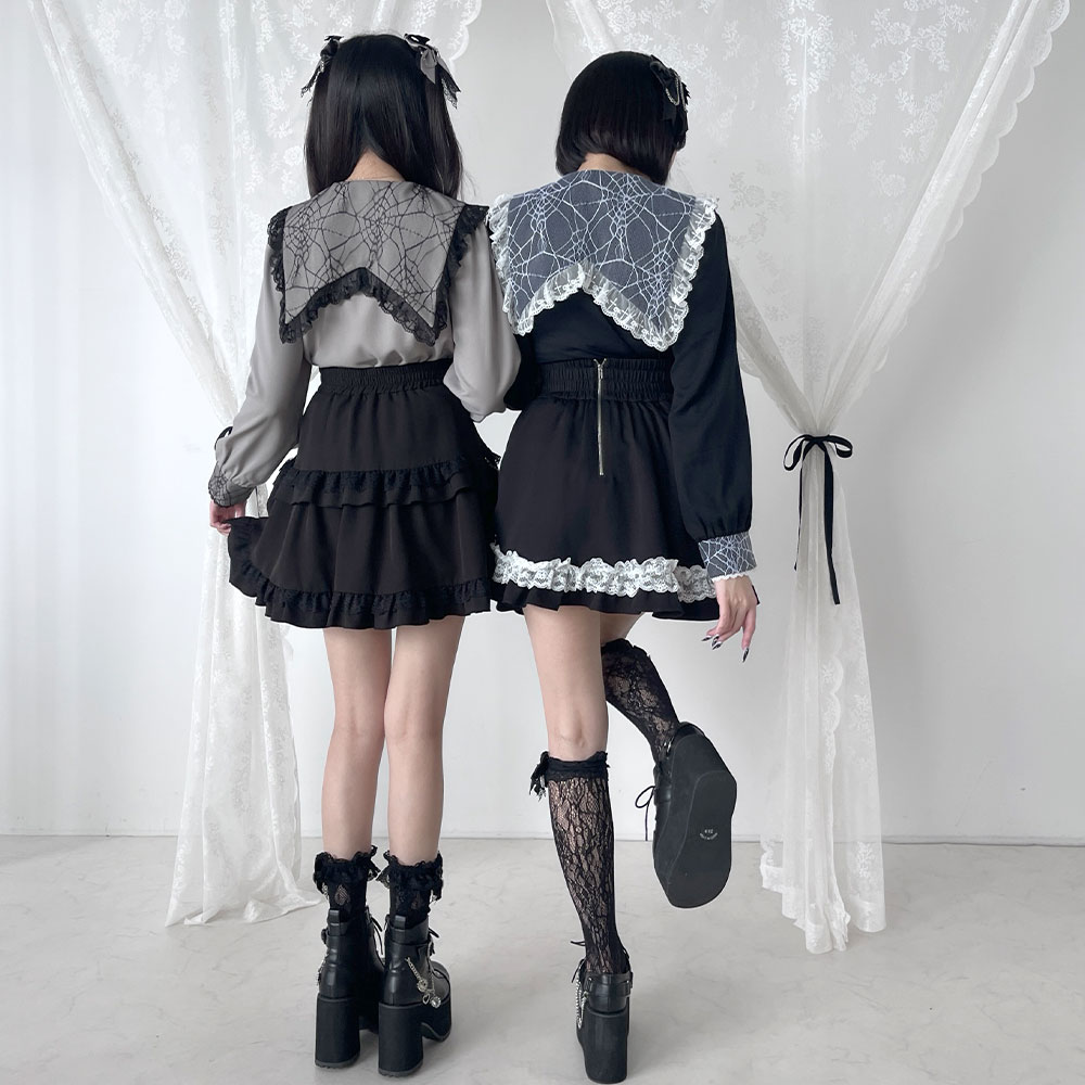 角襟に蜘蛛柄レース重ねていて、十字架柄レースフリルも付いています。