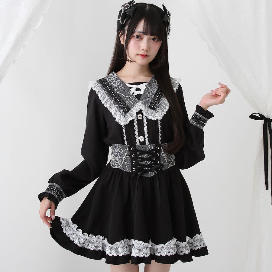 襟部分の蜘蛛レースと胸当てのレースアップがポイントになります。