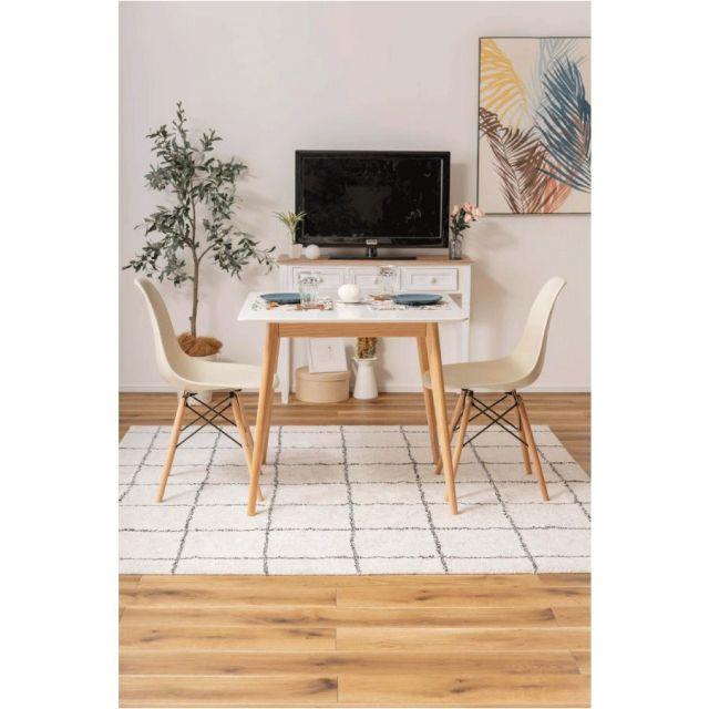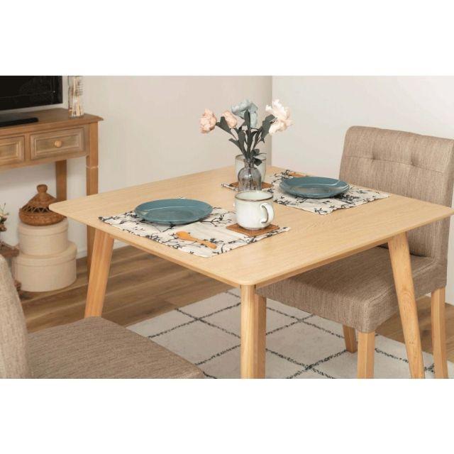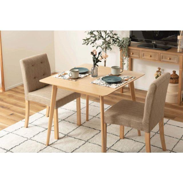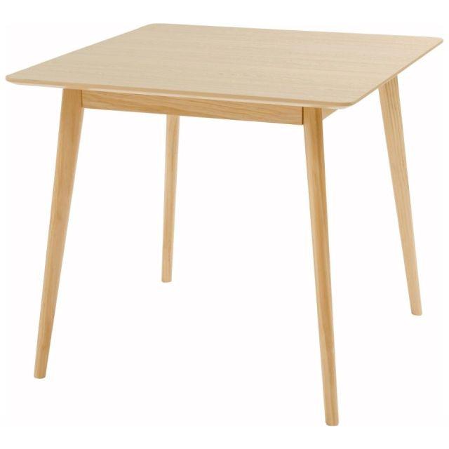 ●どんなインテリアにも合わせやすい、シンプルなスクエアテーブル。●省スペース向けのサイズながら、2人使いでもゆったりと食事ができる80角サイズ。●北欧風テイストの脚がハの字に広がるスッキリとしてデザインなので、どんな種類のチェアとも組み合わせやすいテーブル。●天板下の幕板は天板の反り止めや脚のグラつきを最大限抑え、テーブル全体に安定感を持たせてくれます。●ホワイト・ナチュラルどちらも、天板の表面は凹凸のない木目調仕上げ。●小口部分はデザイン性の高い船底形状。シャープですっきりとした印象なので、木製チェアからスチール素材を使ったチェアまで幅広く合わせられます。●脚裏にはフェルトが付いているので、床への傷防止にもなり安心です。