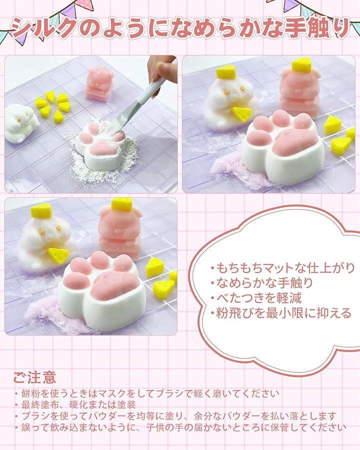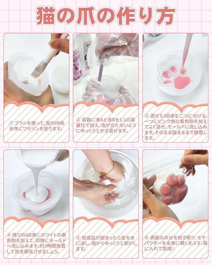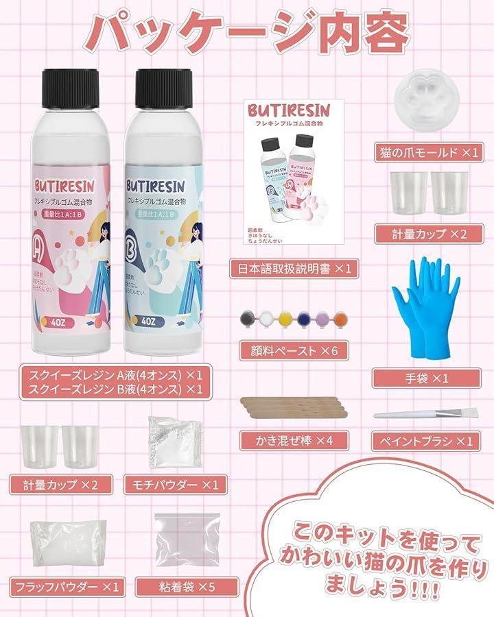 「お得なセット内容」スクイーズ レジン セット付属品: スクイーズレジン A液(4オンス)、スクイーズレジン B液(4オンス)、日本語取扱説明書、手袋、ペイントブラシ、猫の爪モールド、フラッフパウダー、モチパウダー、計量カップ、かき混ぜ棒、粘着袋、顔料ペースト。