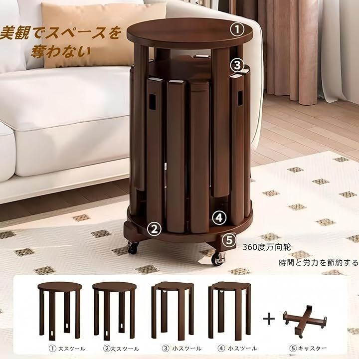 「4in1のスタッキングデザインでスペースを有効活用」:このスツールセットは 2つの大きなスツールと2つの小さなスツール を組み合わせた 「四合一」 のデザインが特徴です。