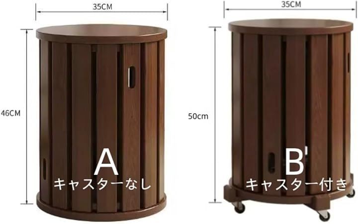 「キャスター付き/キャスターなしの2タイプ」:移動が楽な キャスター付きタイプ と、安定感のある キャスターなしタイプ の2種類をご用意,お好みや使用シーンに合わせて選べます。 Aキャスターなしサイズ:(直径約35x高さ約46cm);Bキャスター付きサイズ:(直径約35x高さ約50cm)。