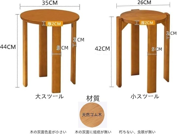 大きいスツール:(直径約35x高さ約44cm) 小さいスツール:(直径約26x高さ約42cm) コンパクトに積み重ねられるため、収納時に場所を取らず、使わないときもすっきりと収まります。