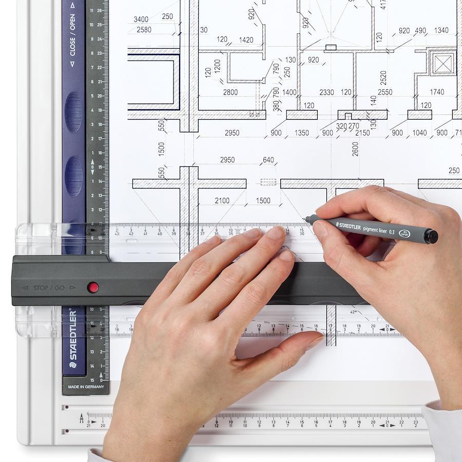 細部にまでこだわり抜いた作りと使い勝手の良さが売りのMADE IN GERMANYのA3判製図板。スムーズな操作性と数々の特徴的な工夫により、高い使用感を実現しています。左右どちらでもワンタッチで操作可能なダブルロックシステムにより、左利きの方も使いやすい設計です。製図板左側の2連の溝に沿って、スライド定規が滑らかに移動します。サイズ:520mm×378mm×23mm